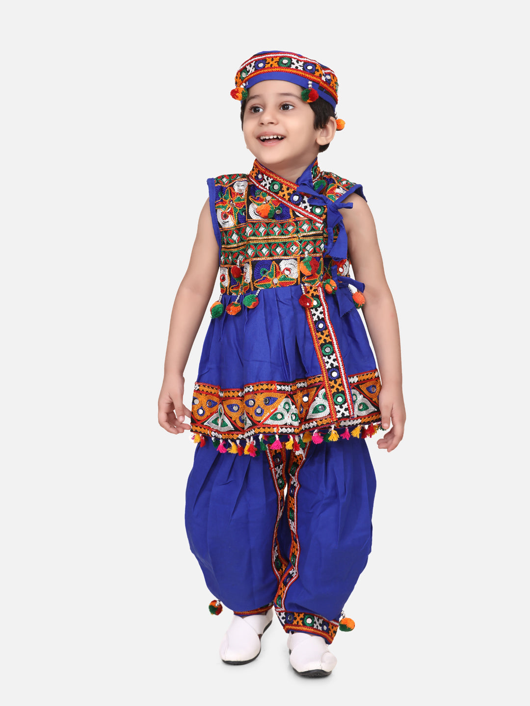 BownBee Kids Boys Navratri Dandiya Garba Embroidered kediya with Dhoti and Cap - Blue