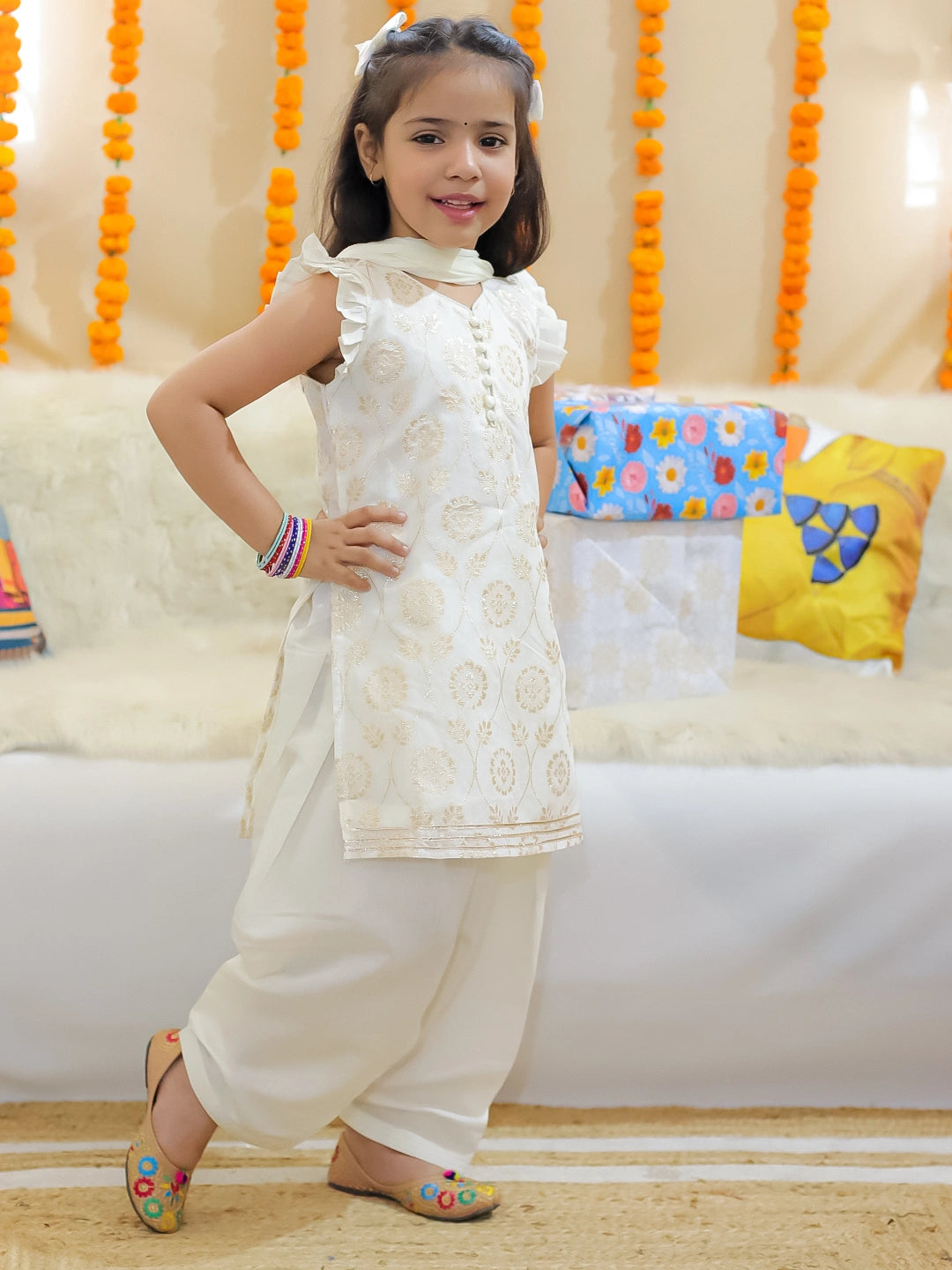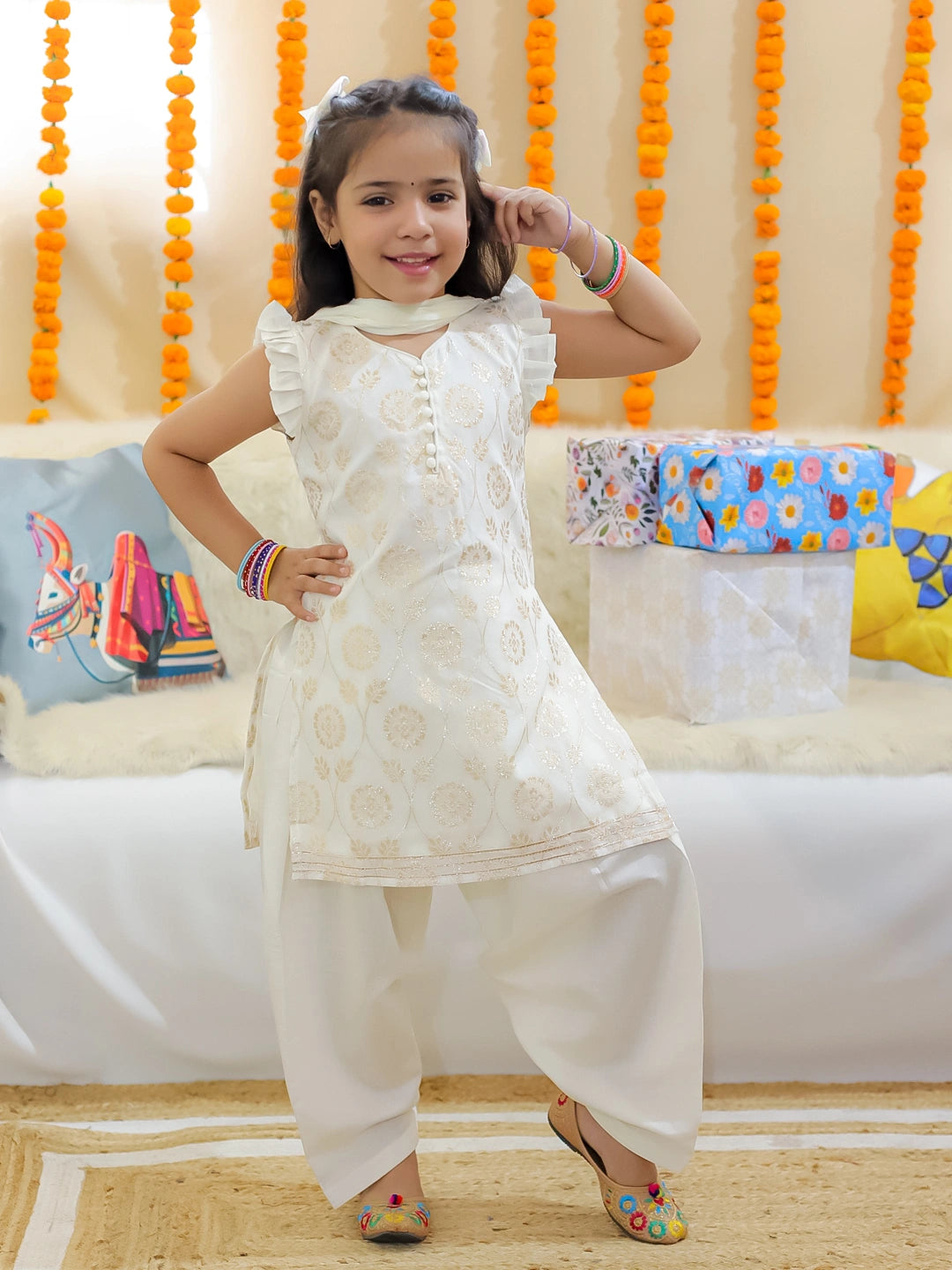 Elevate your little girl's wardrobe with our BownBee Girls Chanderi Kurti set in Off White. Crafted with luxurious Chanderi fabric, this set features a traditional Patiala Salwar and Dupatta. Perfect for special occasions, this elegant ensemble will make her feel like a princess.
