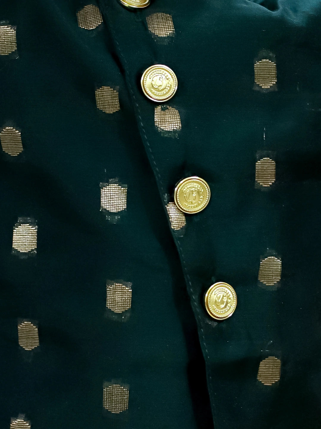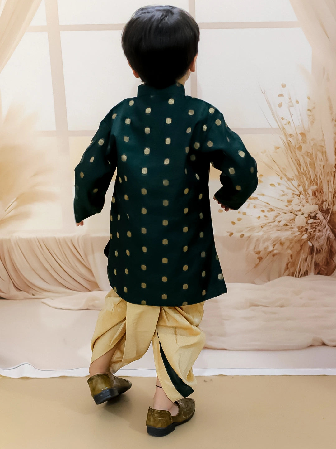 Indulge in luxury with our BownBee Pure Chanderi Full Sleeve Sherwani Dhoti for Boys in Green. Crafted from the finest materials, this outfit exudes sophistication and exclusivity. Its full sleeves and traditional design add a touch of elegance, making it the perfect choice for your little one's special occasions.