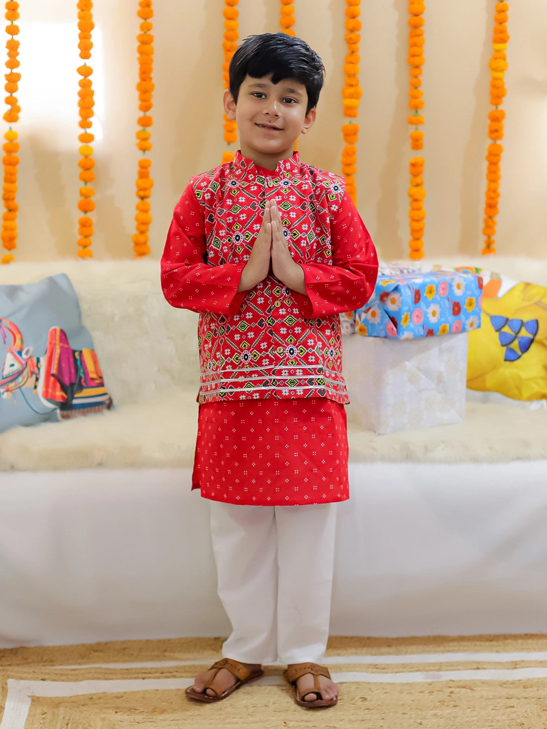 Introducing the sophisticated BownBee Pure Cotton Printed Jacket with Kurta Pajama for Boys in a striking shade of red. Made from premium cotton, this set offers unparalleled comfort and style. Elevate your little one's wardrobe with this exclusive piece designed for the most discerning tastes.