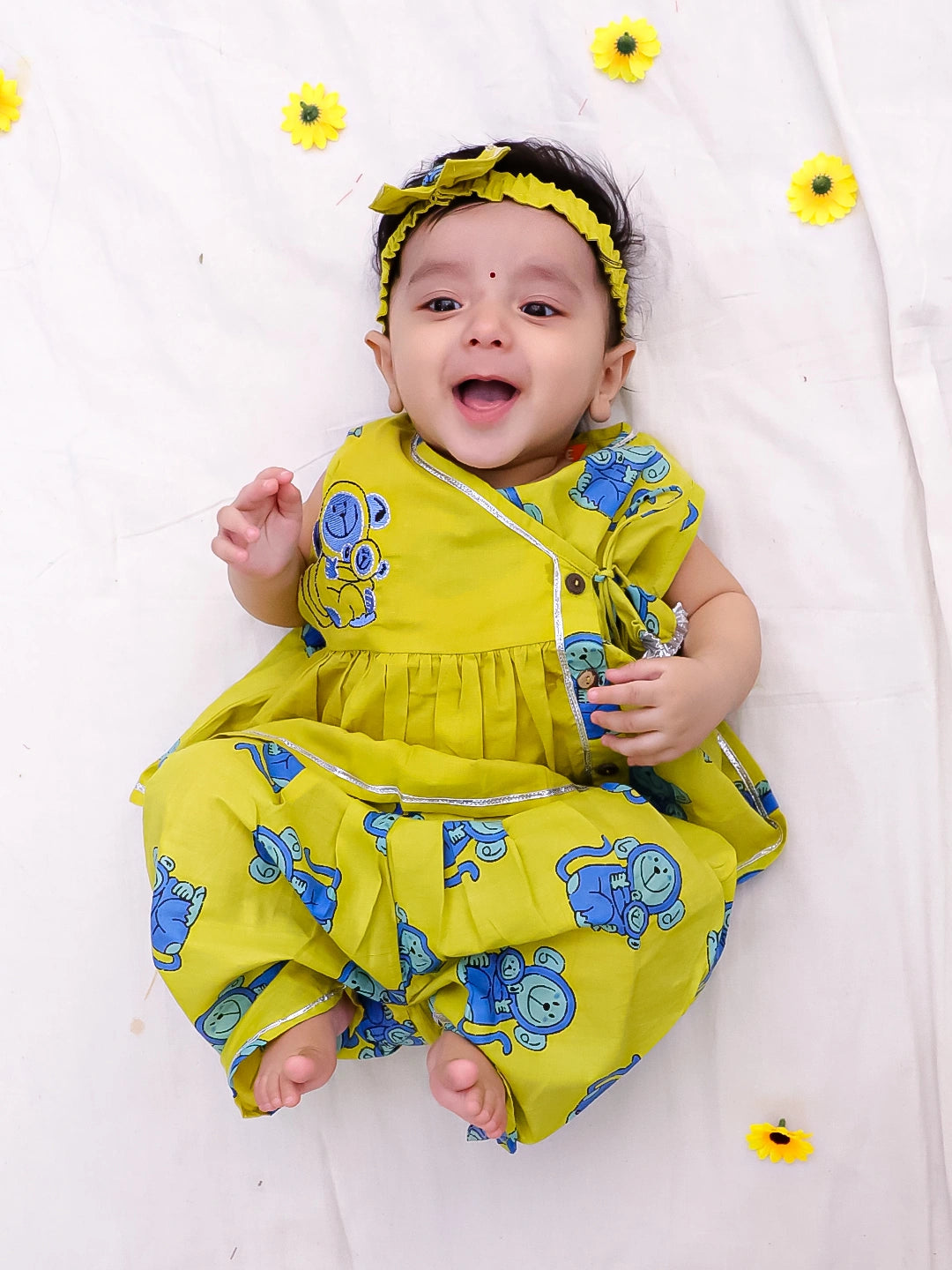 Crafted from pure cotton, this embroidered sleeveless angarakha-style kurti in mustard features a delicate fish print, perfectly paired with a matching dhoti for infant girls. The breathable fabric ensures comfort while the traditional design offers an elegant, timeless look ideal for special occasions and cultural celebrations.