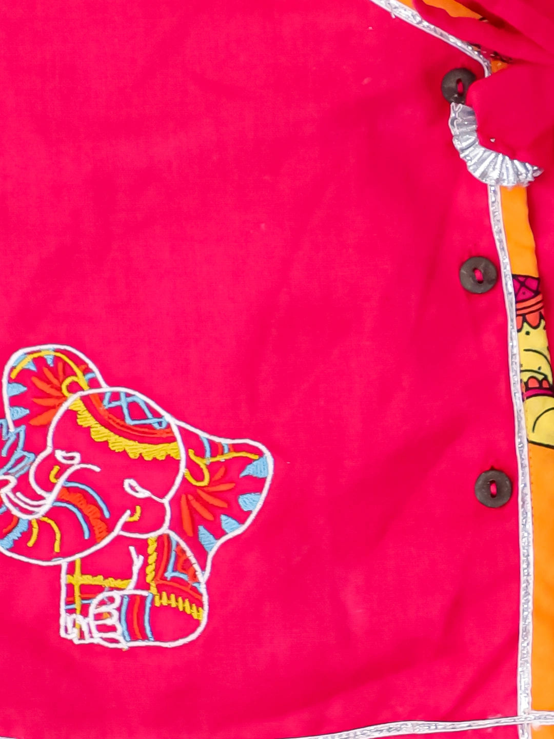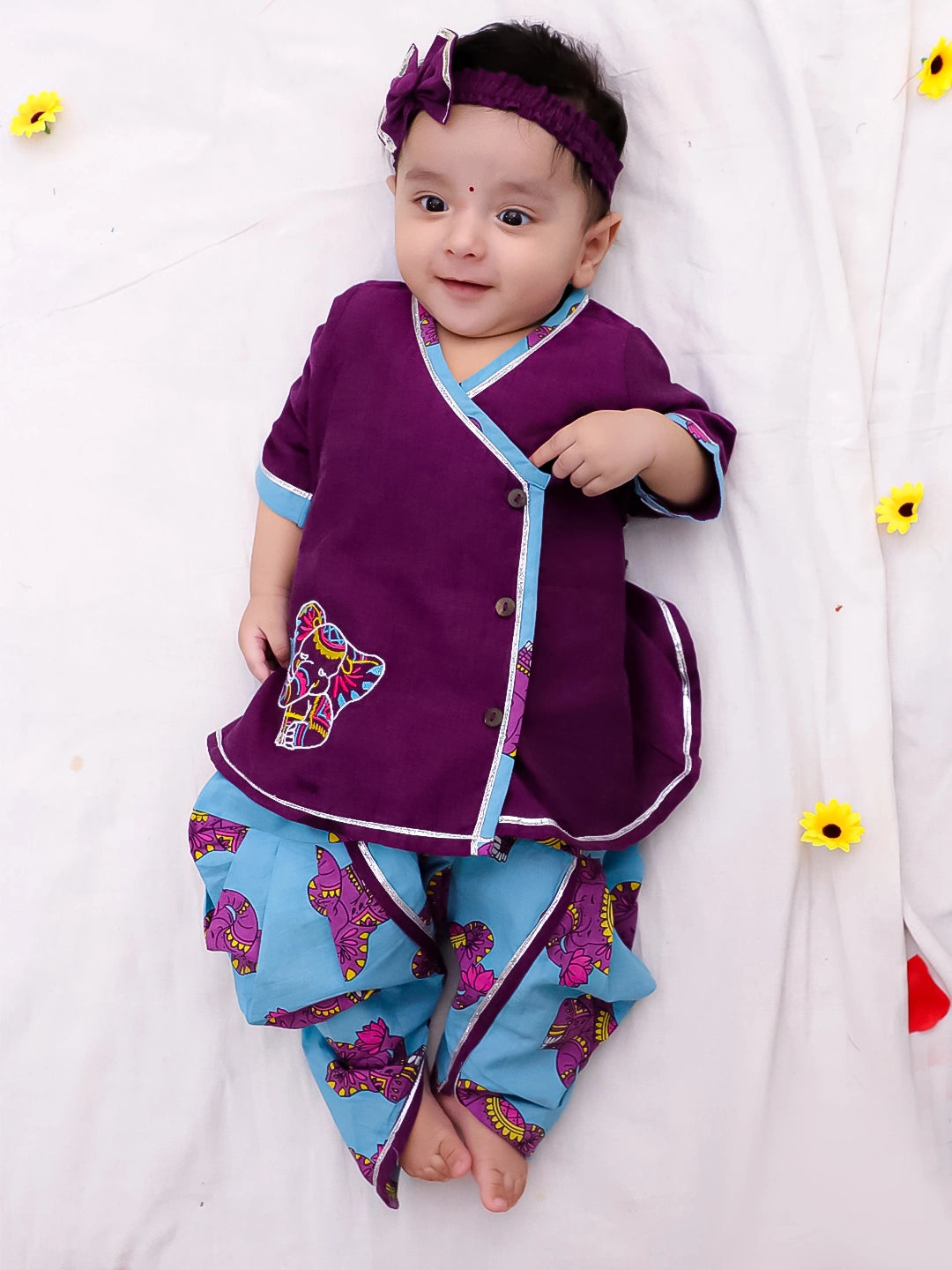 Crafted from pure cotton, this sleeveless Angarakha-style kurti features delicate embroidery and a charming elephant print, offering both comfort and elegance for infant girls. Paired with a coordinating dhoti, this ensemble combines traditional Indian design with breathable fabric, ensuring your little one stays cool and stylish during warm days. Perfect for festive occasions or casual wear, it brings a refined touch to children's wardrobe essentials.