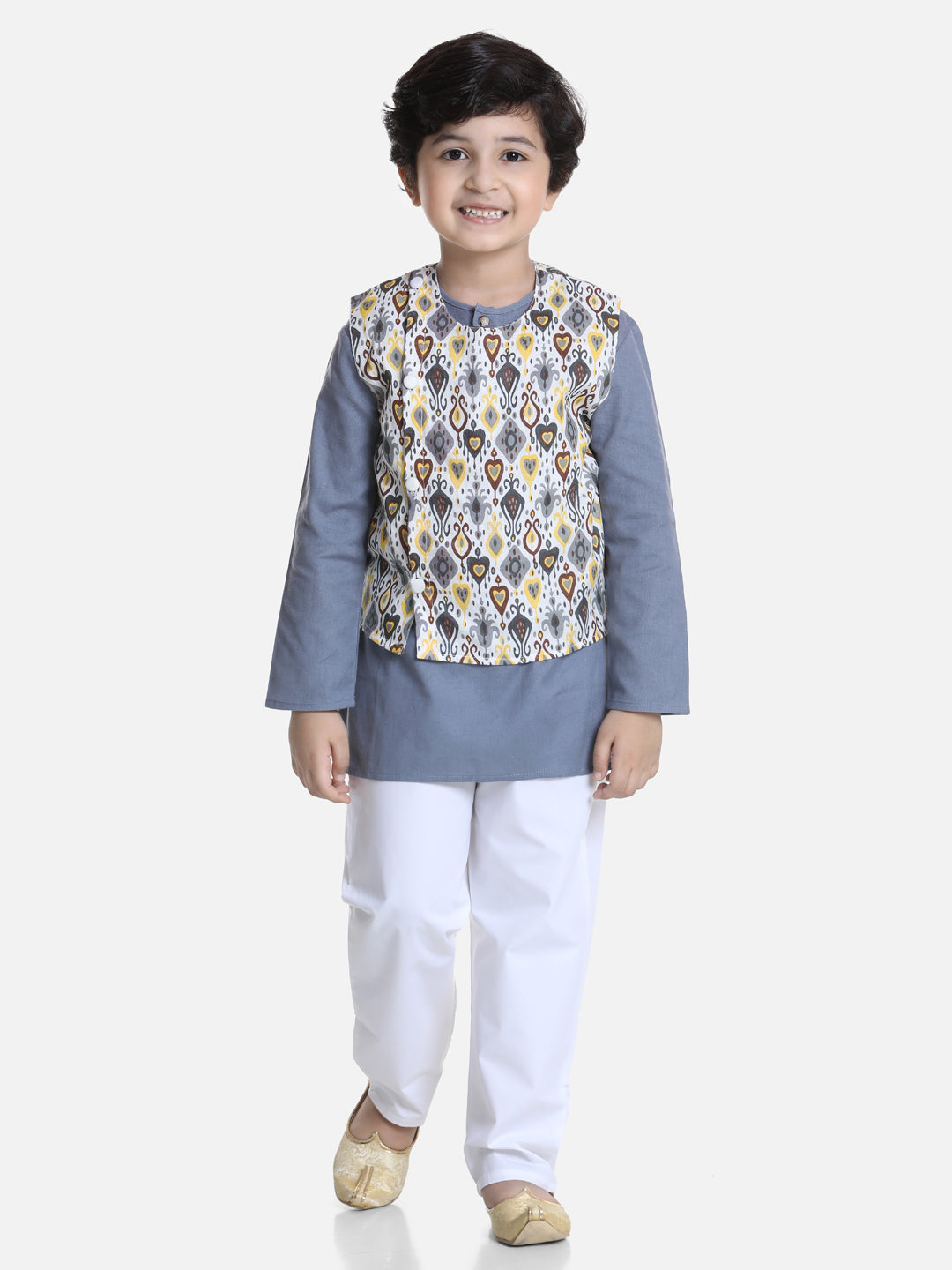 BownBee Full Sleeves Printed Attached Jacket Kurta & Pyjama Set - Grey