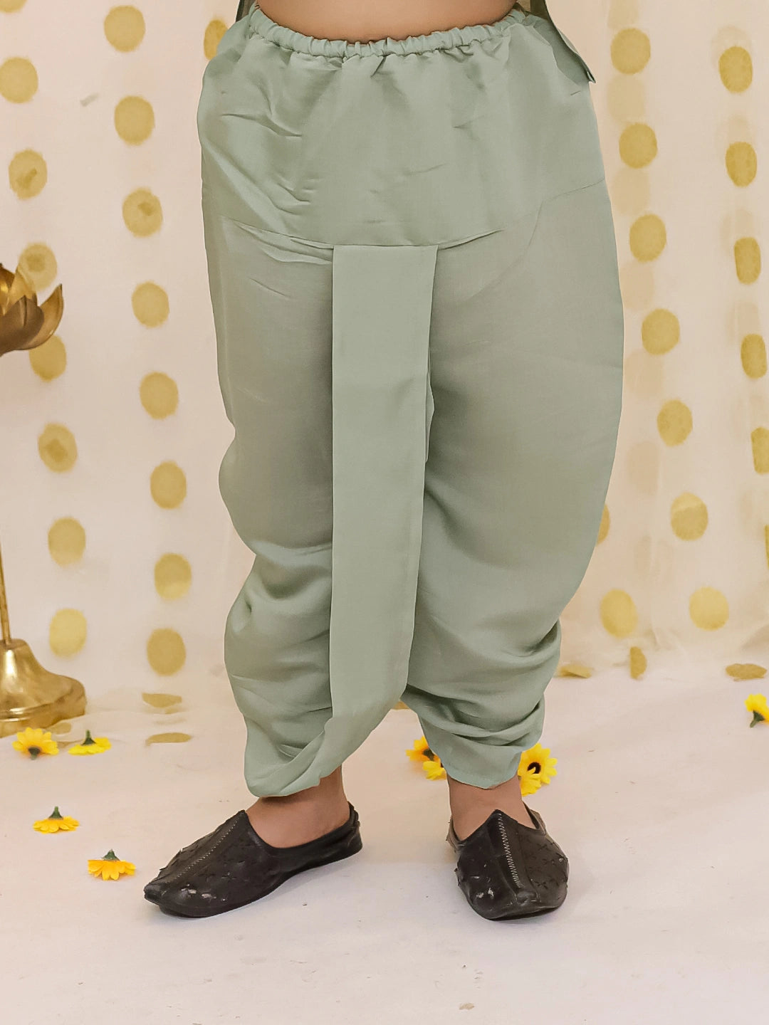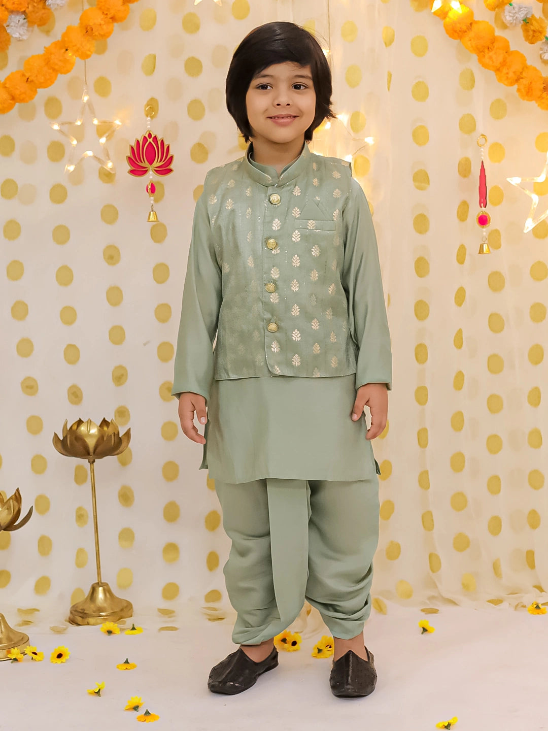 BownBee Festive Chanderi Jacket With Solid Dhoti Kurta Set For Boys - Green