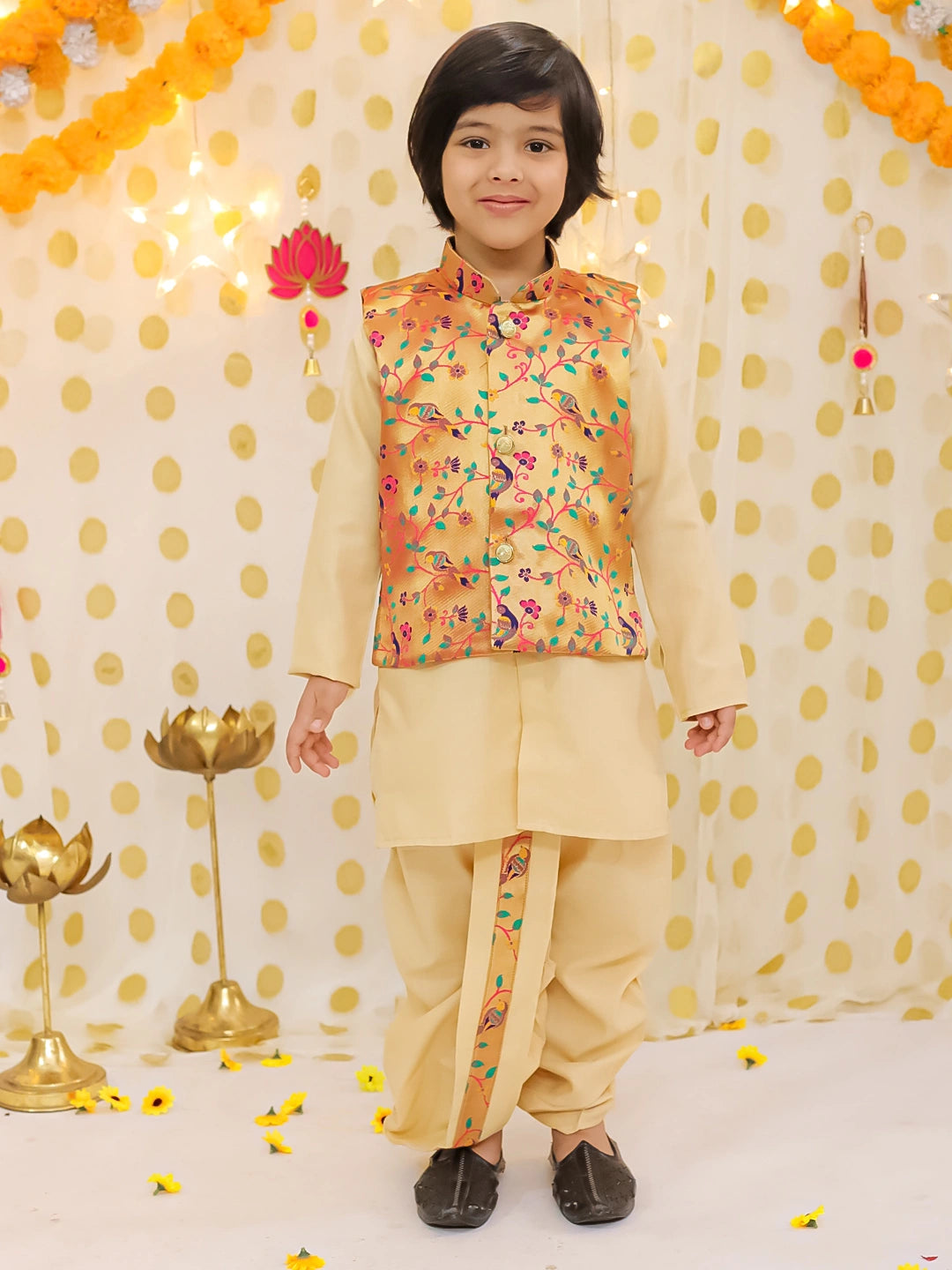 BownBee Festive Jacquard jacket With Solid Dhoti Kurta Set For Boys - Golden