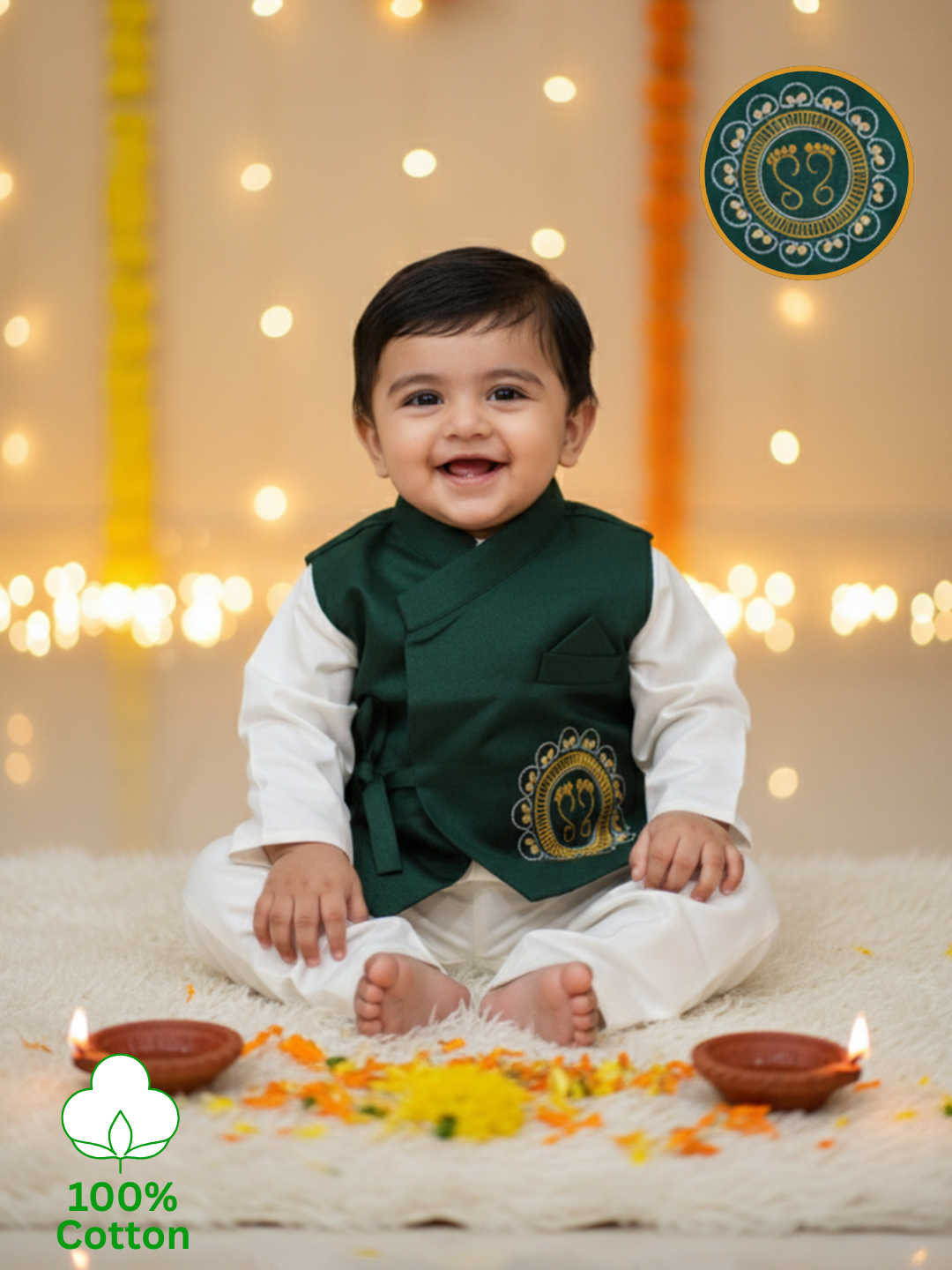 BownBee Pure Cotton Embroidered  Kurta Pajama With Jacket Set For Boys -Green