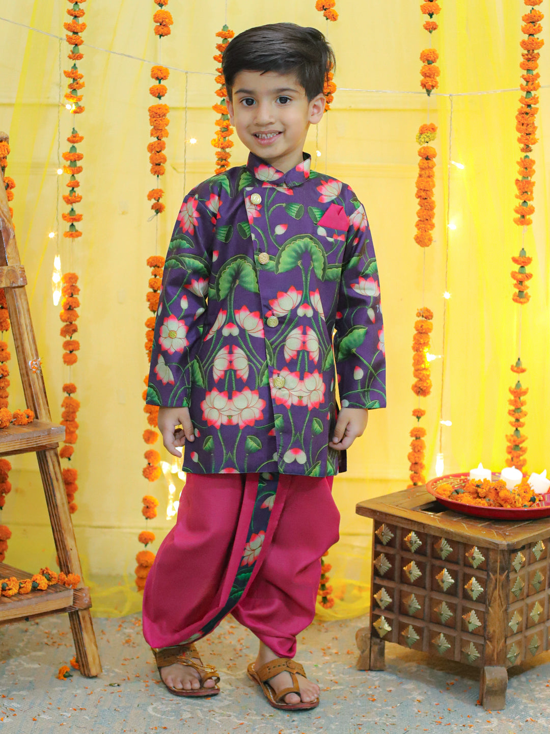 BownBee Boys Ethnic Festive Floral Printed Full Sleeve Sherwani with Cotton Dhoti -Purple