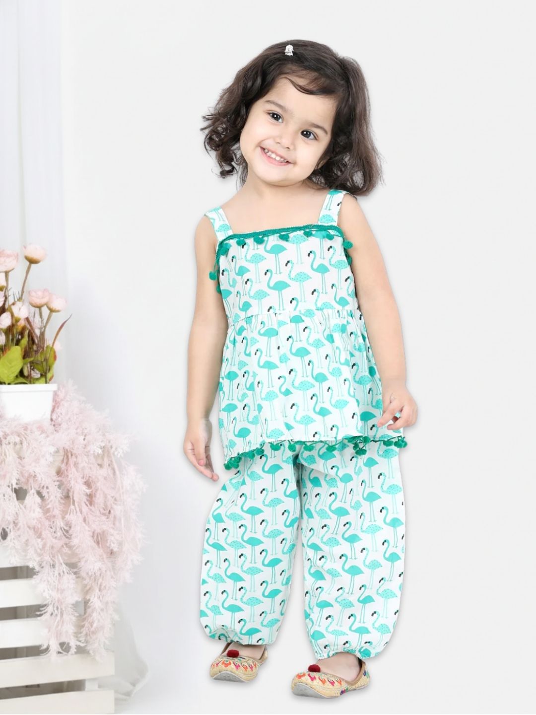 BownBee Flamingo Print Pure Cotton Top Harem Set For Girls - Green