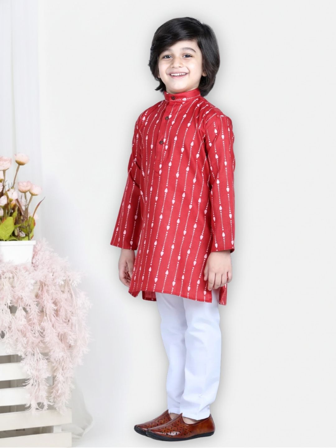 BownBee Printed Full Sleeve Cotton Kurta Pajama for Boys- Red