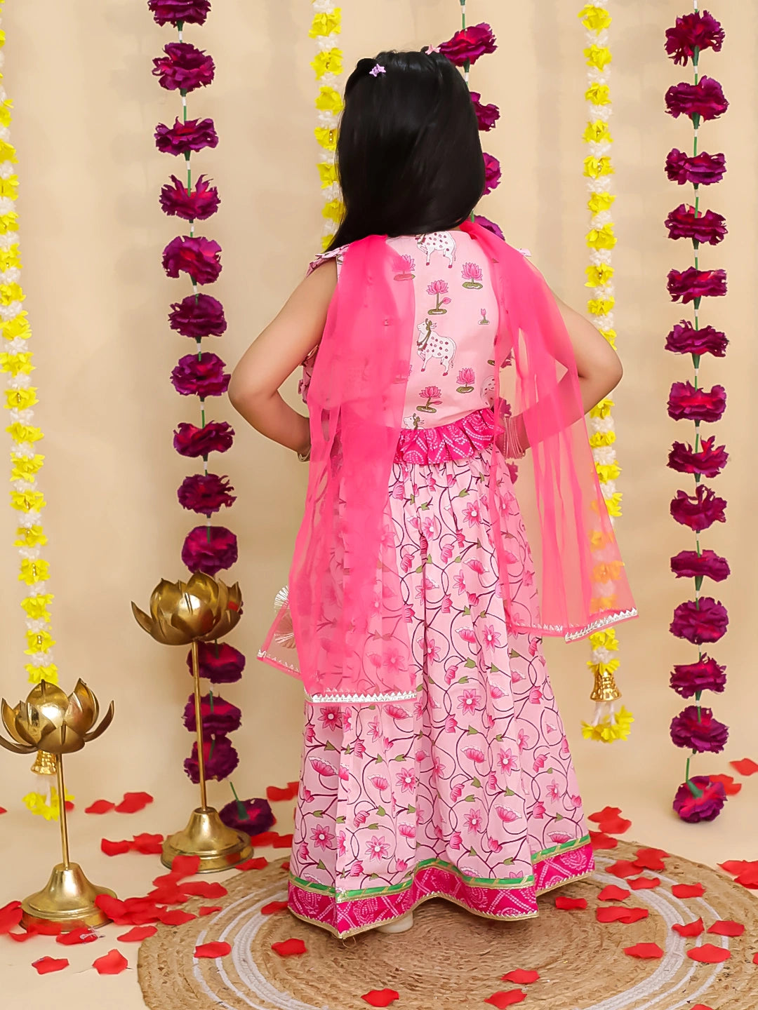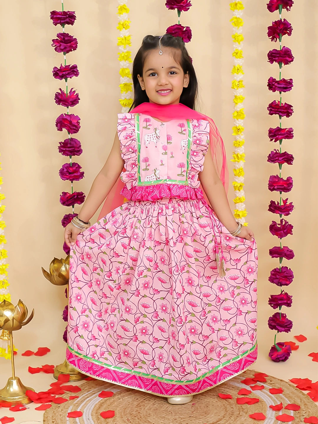 BownBee Pure Cotton Sleeveless Lehenga Choli Set With DupattaFor Girls - Pink