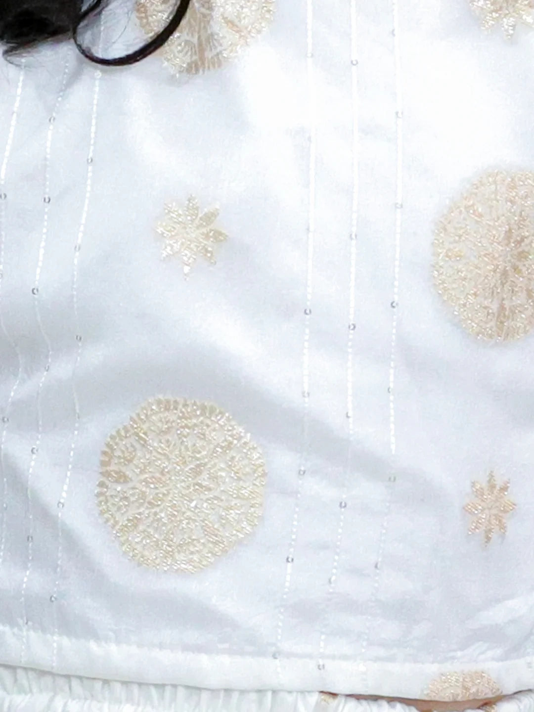 Elevate your little girl's wardrobe with our exquisite BownBee Pure Chanderi Halter Neck Top with Lehenga in white. Made from the finest chanderi fabric, this top with lehenga set exudes elegance and sophistication. The halter neck design adds a touch of luxury, making her stand out at any special occasion.