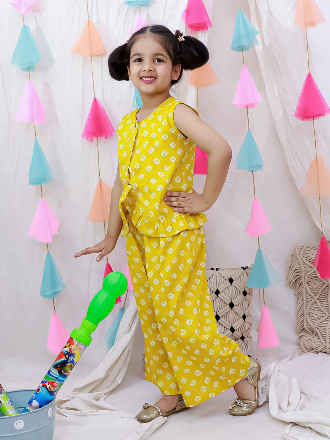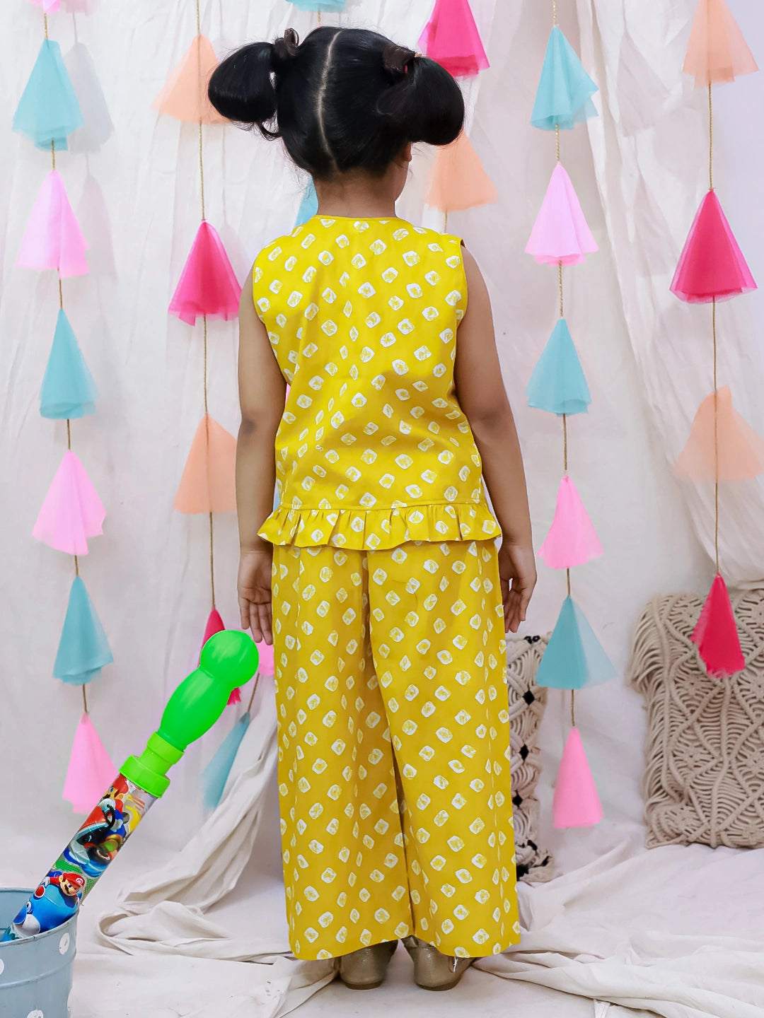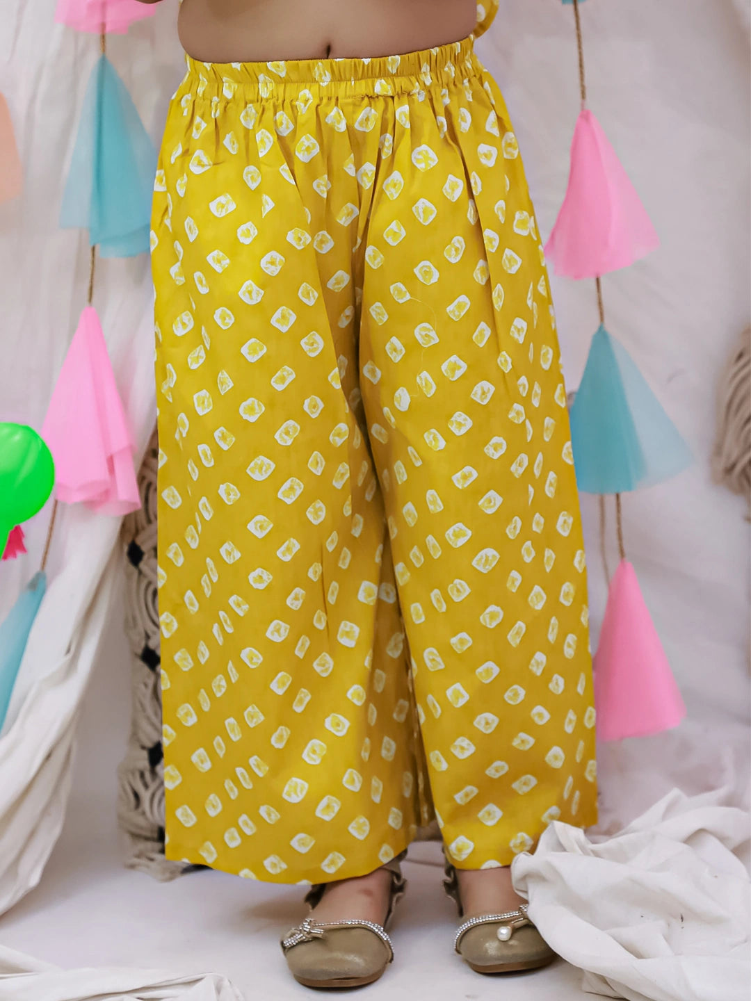 Introduce your daughter to timeless ethnic elegance with this exquisite pure cotton Badhni crop top paired with coordinating palazzo pants. Crafted from breathable, skin-friendly fabric, this vibrant yellow ensemble celebrates traditional Indian aesthetics while ensuring all-day comfort. The intricately designed crop top features authentic Badhni detailing, making it perfect for festivals, celebrations, or special occasions. The flowing palazzo silhouette complements the structured top beautifully, creating a balanced, graceful look. Ideal for girls who appreciate cultural fashion with contemporary flair.