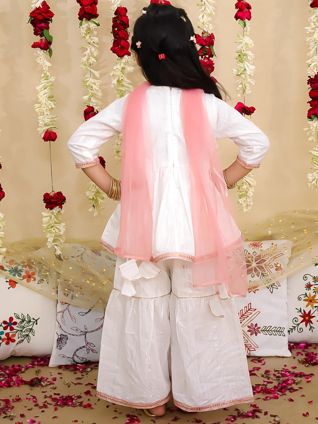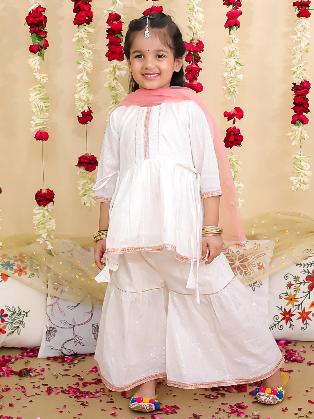 BownBee Pure Cotton Lurex Kurti with Sharara & Dupatta Set for Girls | Elegant Ethnic Outfit – White (Pre-Order)