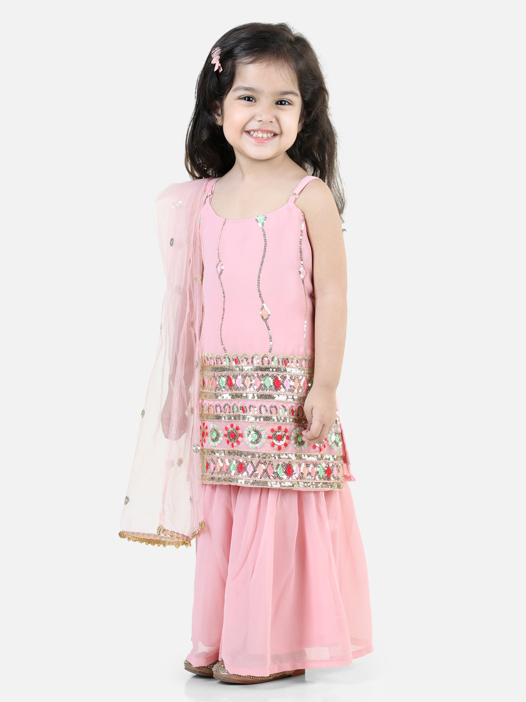 BownBee Embroidered Georgette Kurta with Sharara Dupatta for Girls- Pink