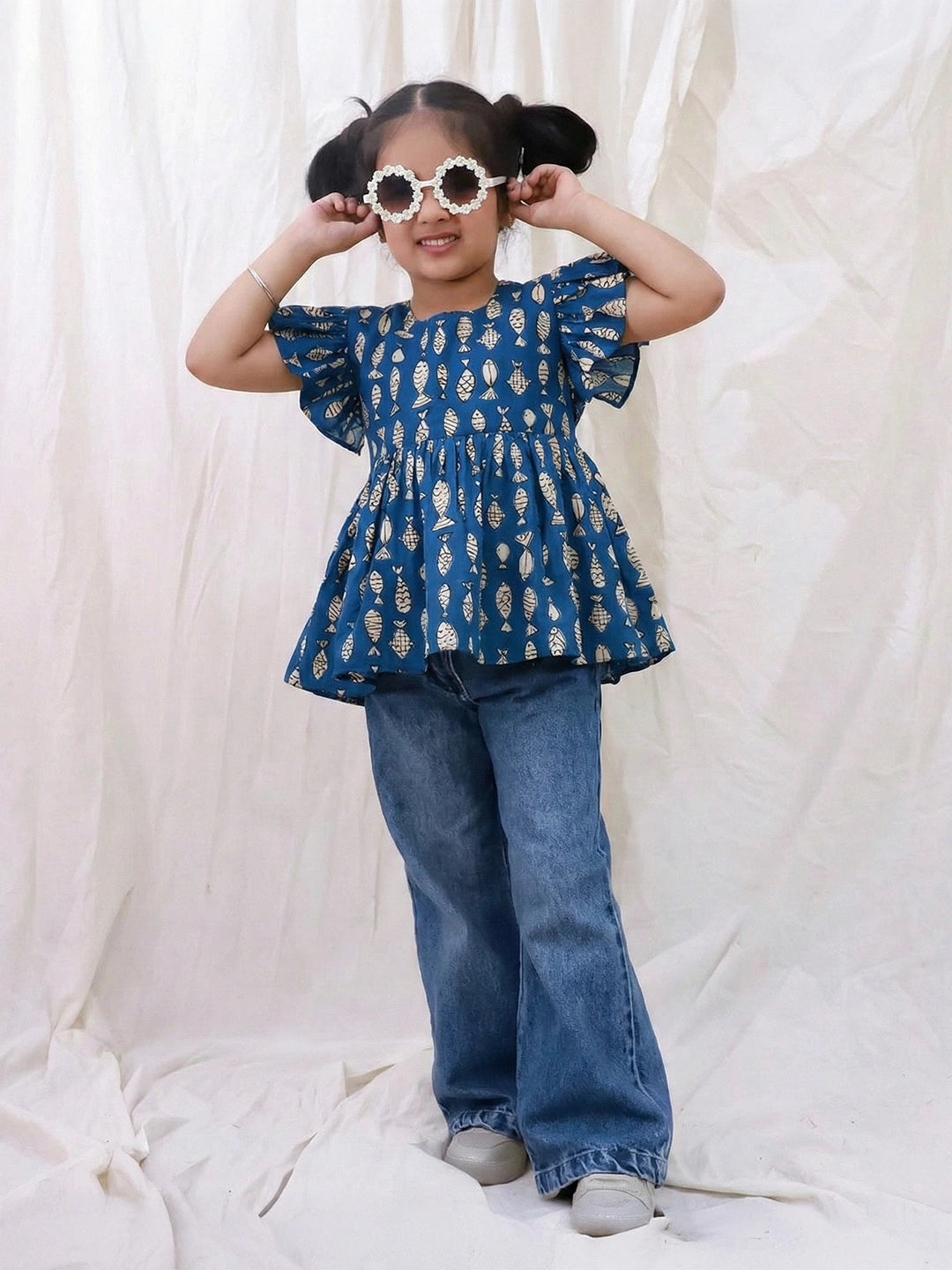 Elevate your daughter's wardrobe with this sophisticated pure cotton top in a warm navy blue hue. The delicate ruffle sleeves add an elegant touch, perfect for both casual outings and special occasions. Crafted from breathable cotton, this piece ensures comfort throughout the day while maintaining its shape and color. The timeless design pairs effortlessly with jeans, skirts, or traditional wear, making it a versatile essential for any young girl's collection. Gentle on sensitive skin and easy to care for, this top combines style with practicality.