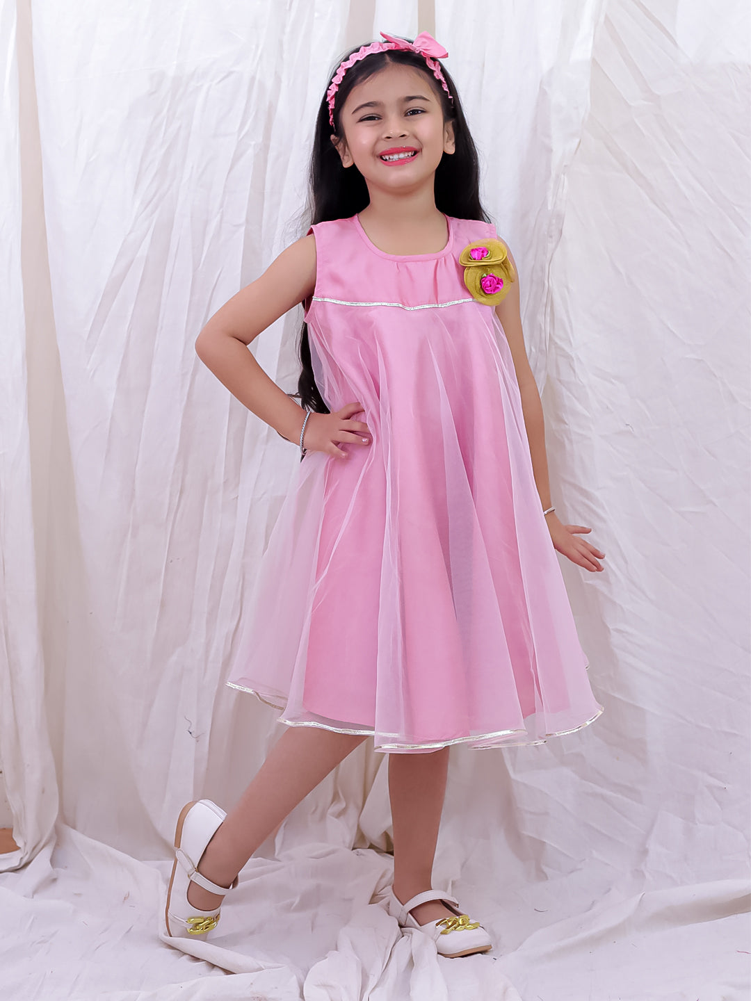 BownBee Sleeveless Taffeta Party Frock With Hairband For Girls - Pink