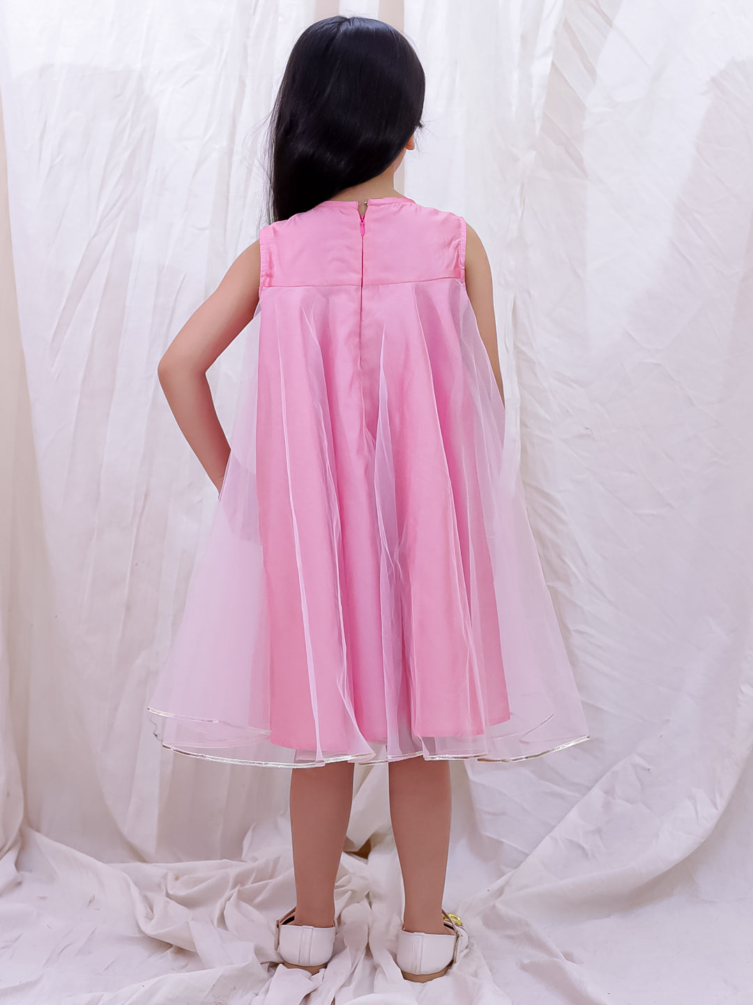Elevate your daughter's special occasions with this exquisite sleeveless party frock crafted from premium taffeta fabric. The sophisticated pink hue and graceful silhouette create an enchanting look perfect for celebrations, festivals, and formal gatherings. The crisp taffeta material offers a refined drape that catches light beautifully, while the sleeveless design ensures comfort during festivities. Complemented by a coordinating hairband, this ensemble provides a complete, polished appearance. Ideal for creating cherished memories at weddings, birthday parties, and cultural events, this frock combines traditional elegance with contemporary styling for the modern Indian child.