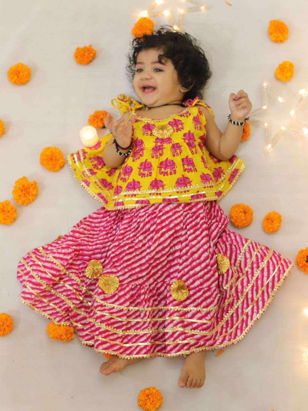 BownBee Pure Cotton Top Leheriya Lehenga for Baby Girls-Yellow