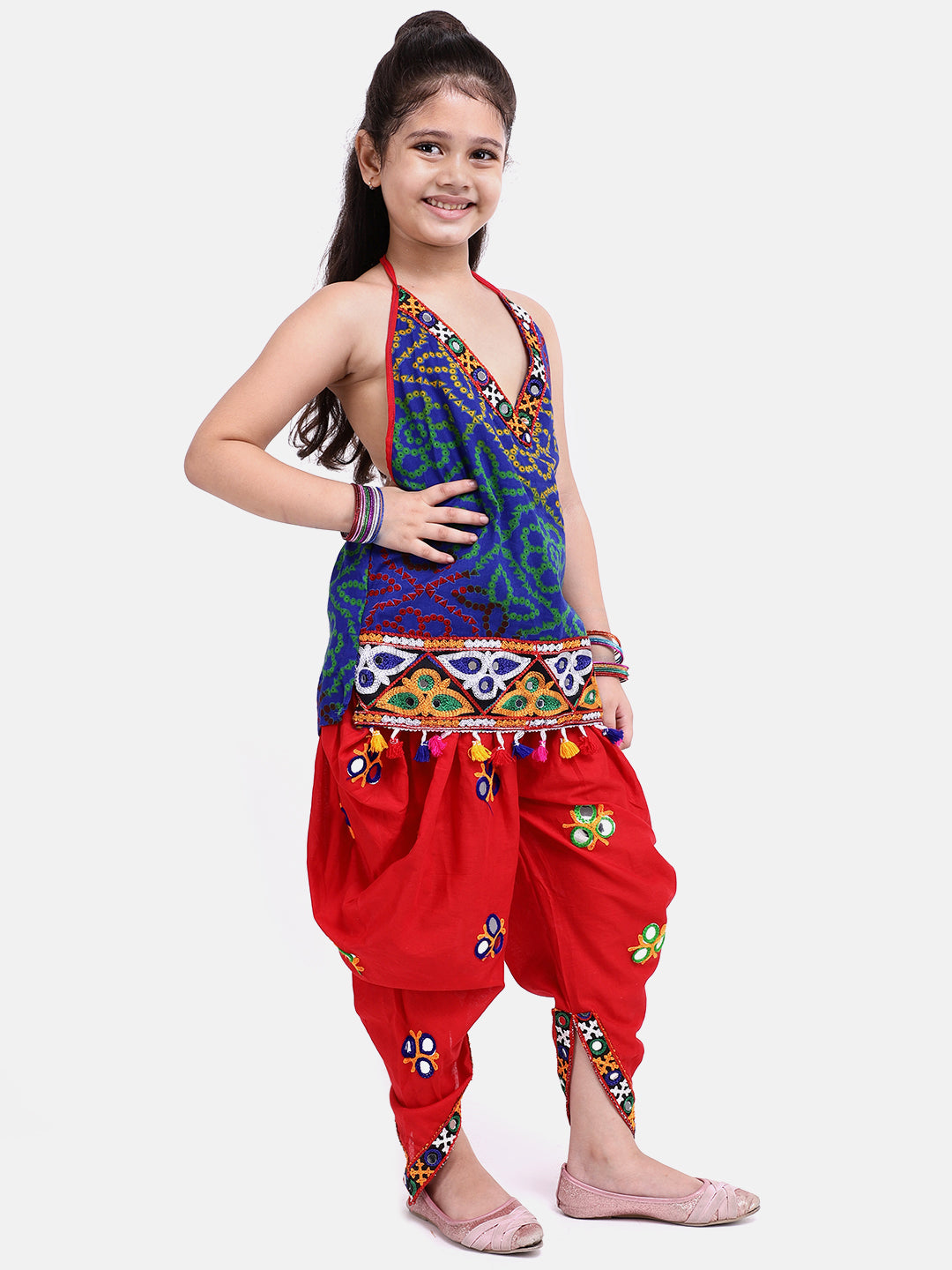 BownBee Bandhani Halter Top With Embroidery Dhoti- Red