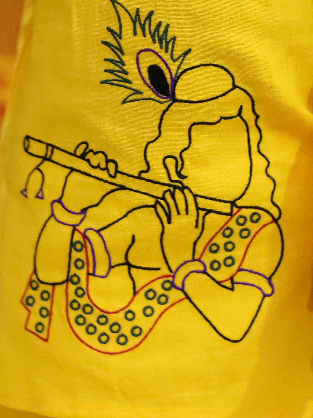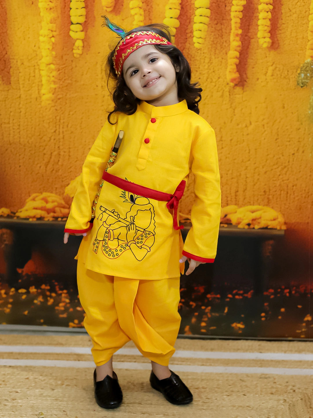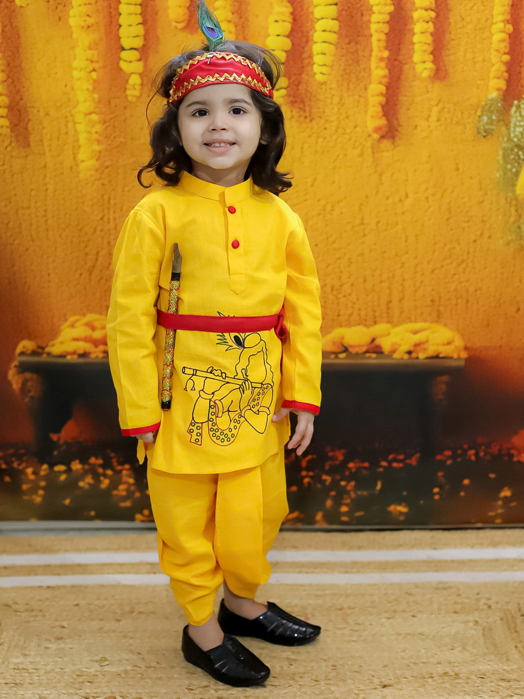 BownBee Cotton Full Sleeve Kurta Dhoti with Mukut Belt and Bansuri Kanhaiya Set - Yellow