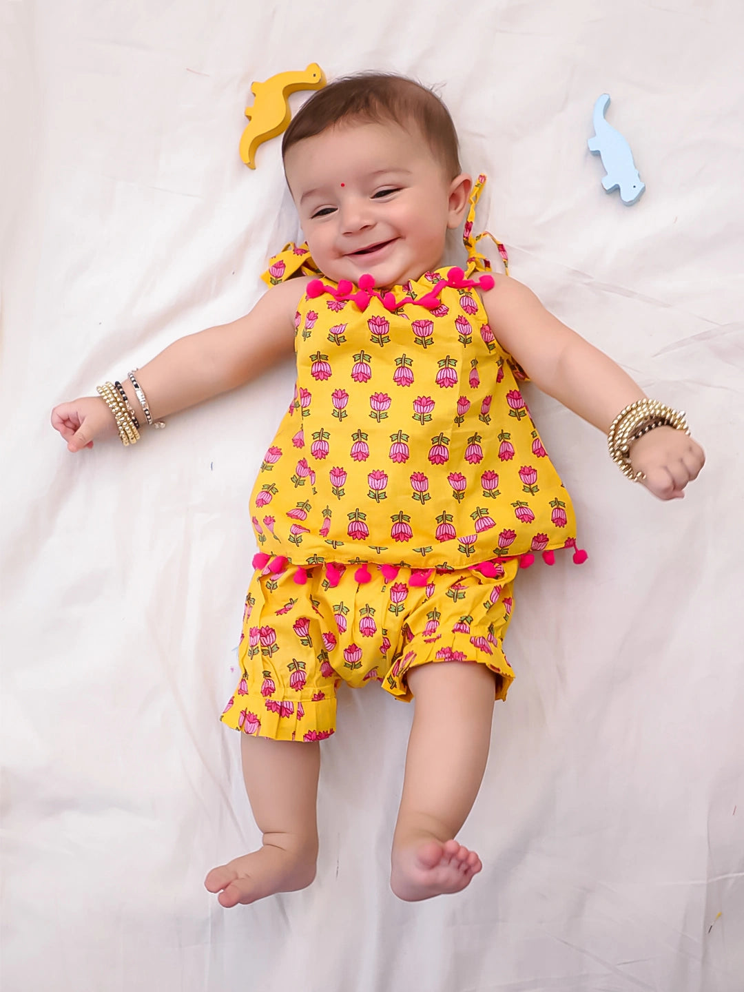 BownBee Infants Pure Cotton Printed Sleeves Jhabla Set for Girls | Soft & Comfortable Baby Wear- Yellow