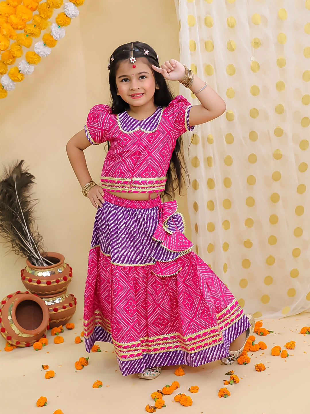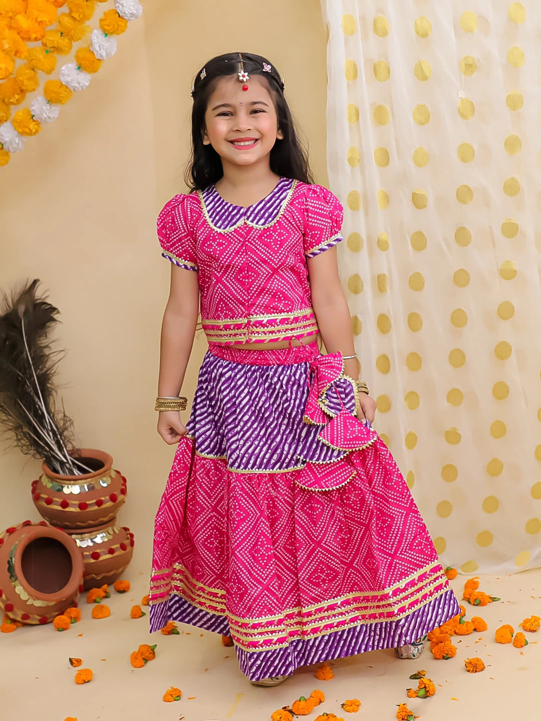 BownBee Bandhani Pure Cotton Short Sleeves Lehenga Choli Set For Infant Girls -Pink