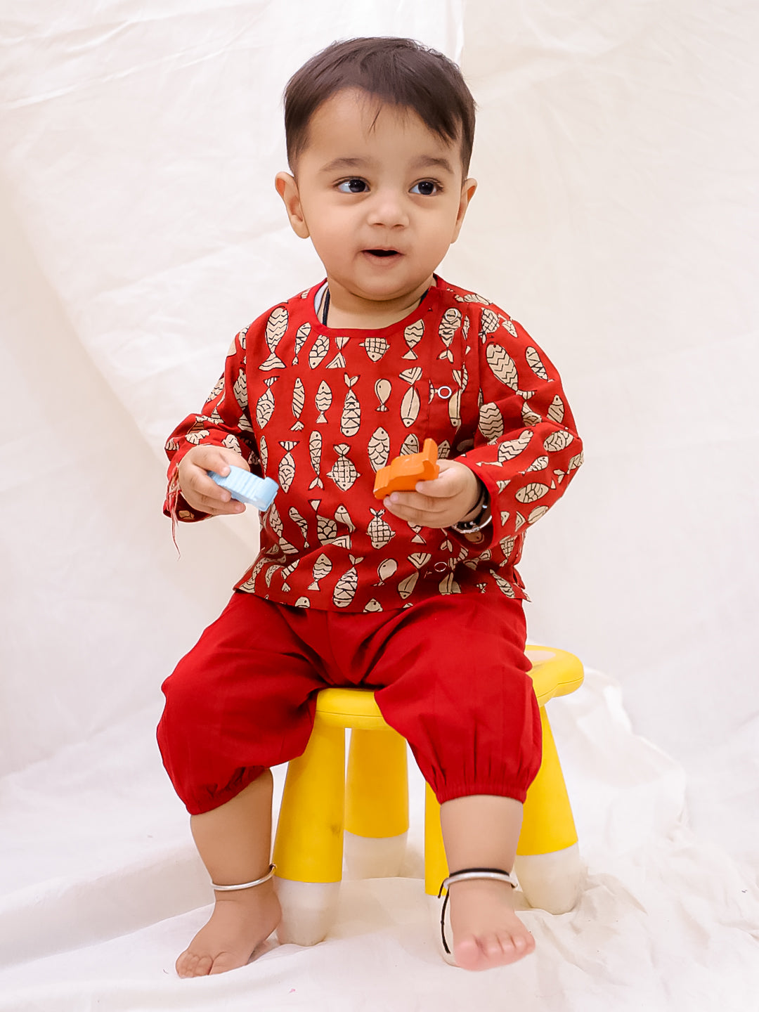 BownBee Festive 3/4th Sleeves Pure Cotton Printed Lehenga Choli With Dupatta Set For Girls - Red