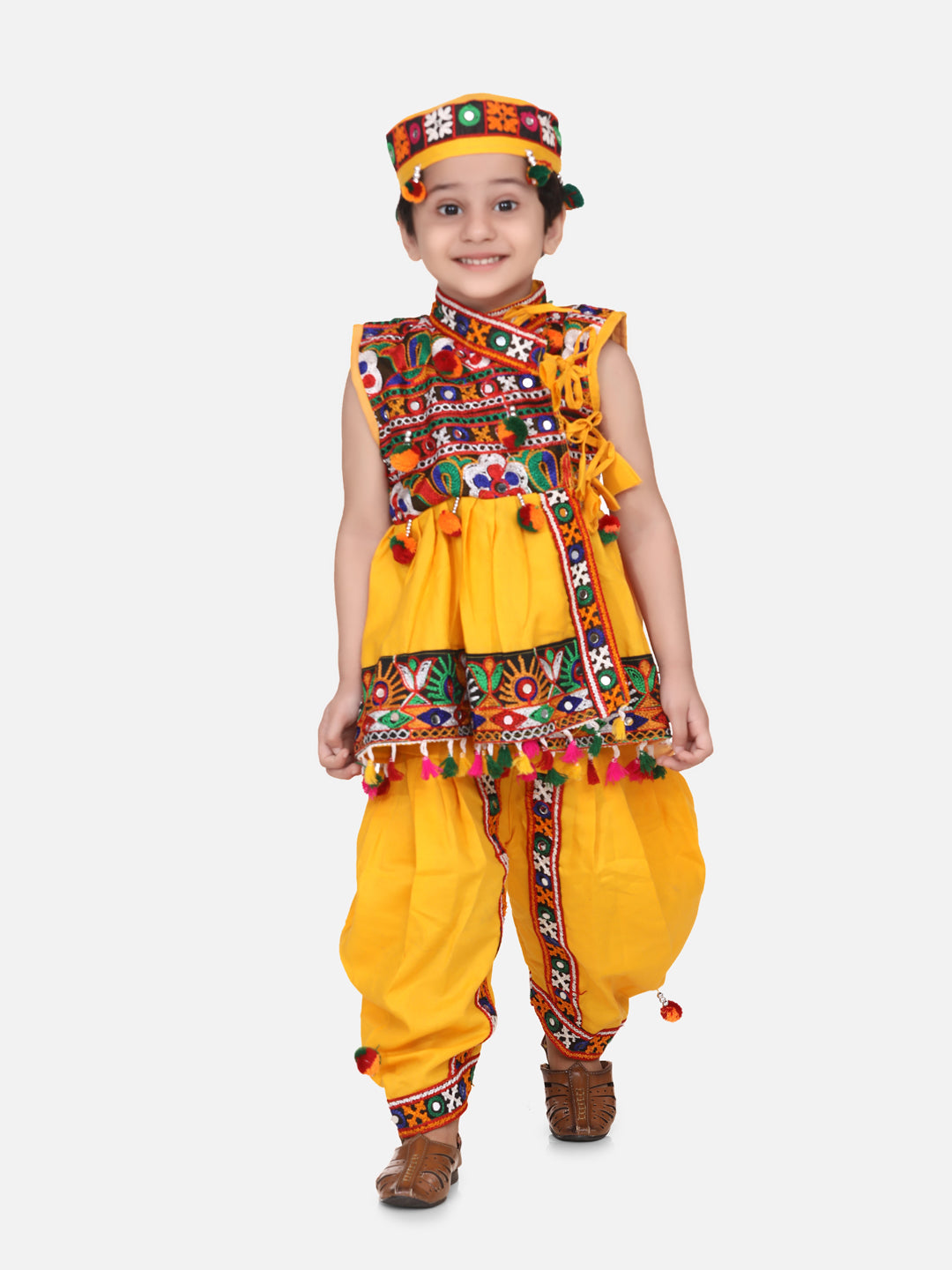 BownBee Kids Boys Navratri Dandiya Garba Embroidered Sleeveless Kedia Dhoti set- Yellow