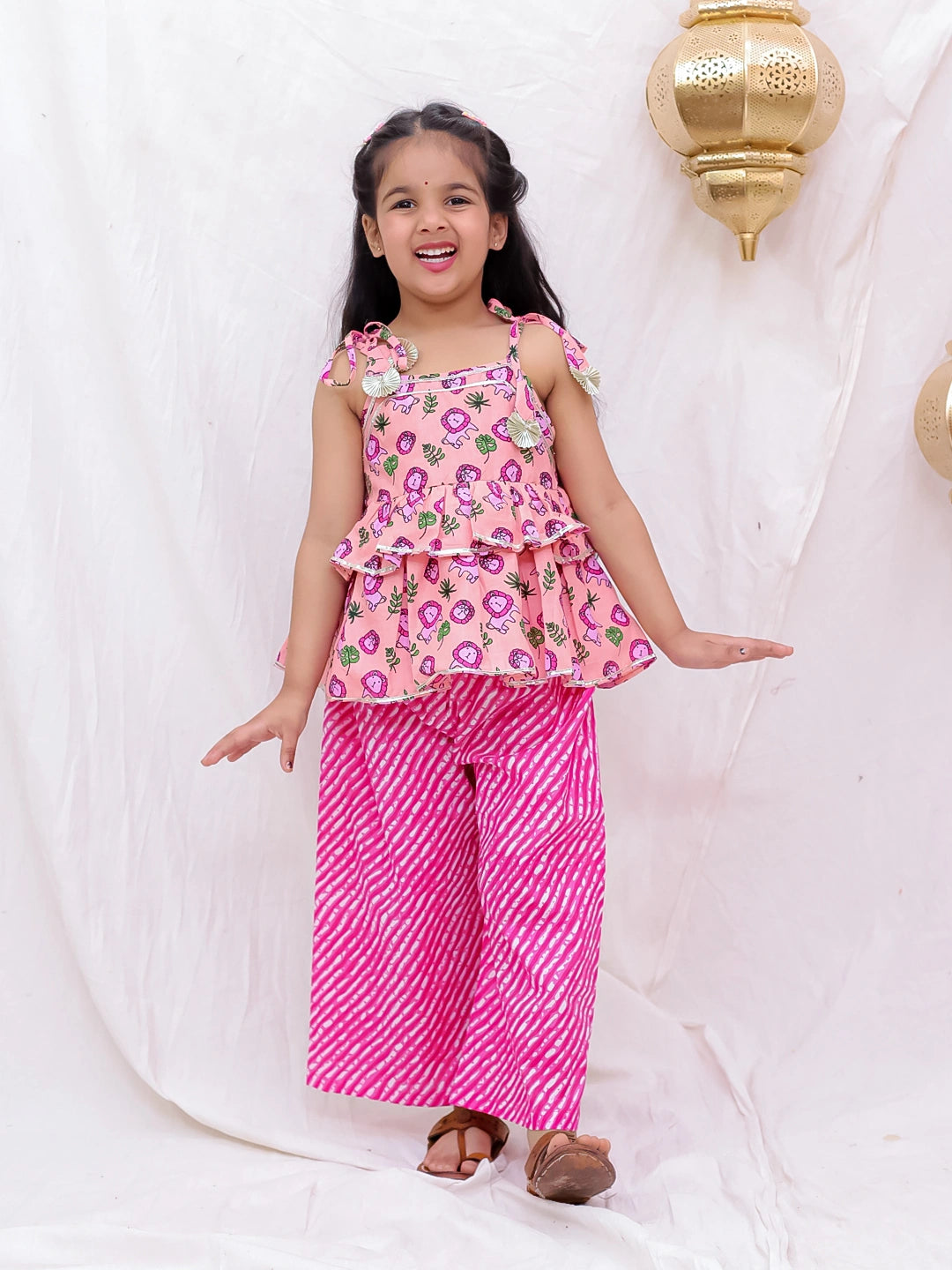 Introduce your daughter to effortless style with this charming pure cotton tie-up top and palazzo set. Crafted from breathable, soft cotton fabric, this two-piece ensemble offers comfort for everyday wear and special occasions alike. The adjustable tie-up neckline adds a playful touch, while the relaxed palazzo pants provide freedom of movement for active play. Perfect for warm weather, this versatile set combines traditional Indian aesthetics with modern comfort, making it an ideal choice for fashion-forward young girls.