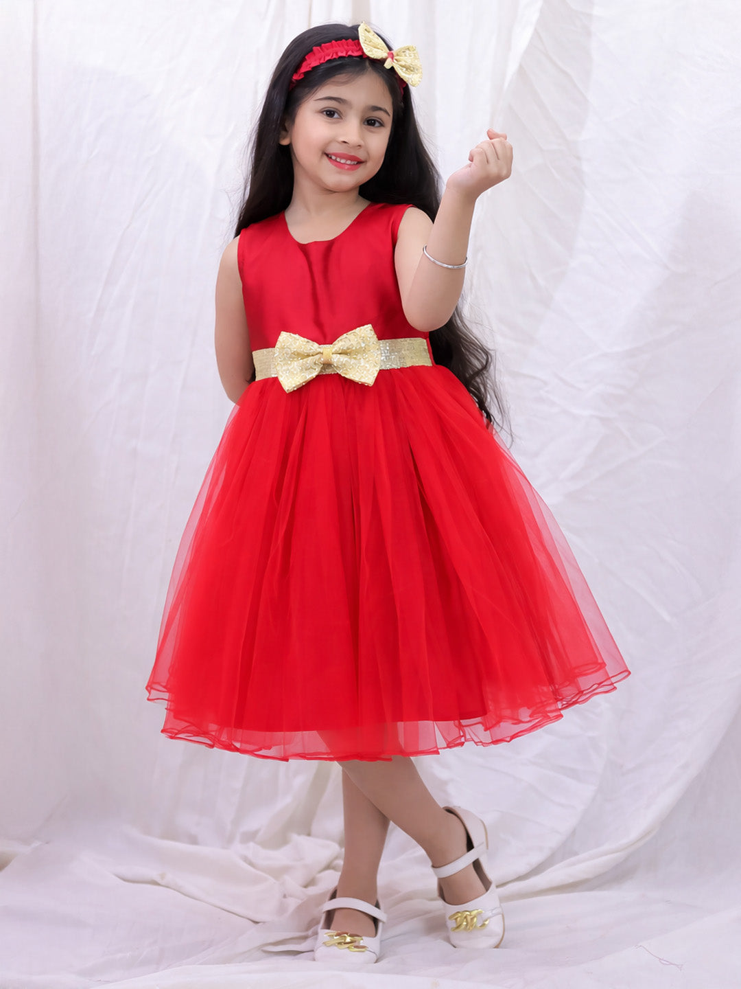 BownBee Sleeveless Taffeta Party Frock With Hairband For Girls - Red