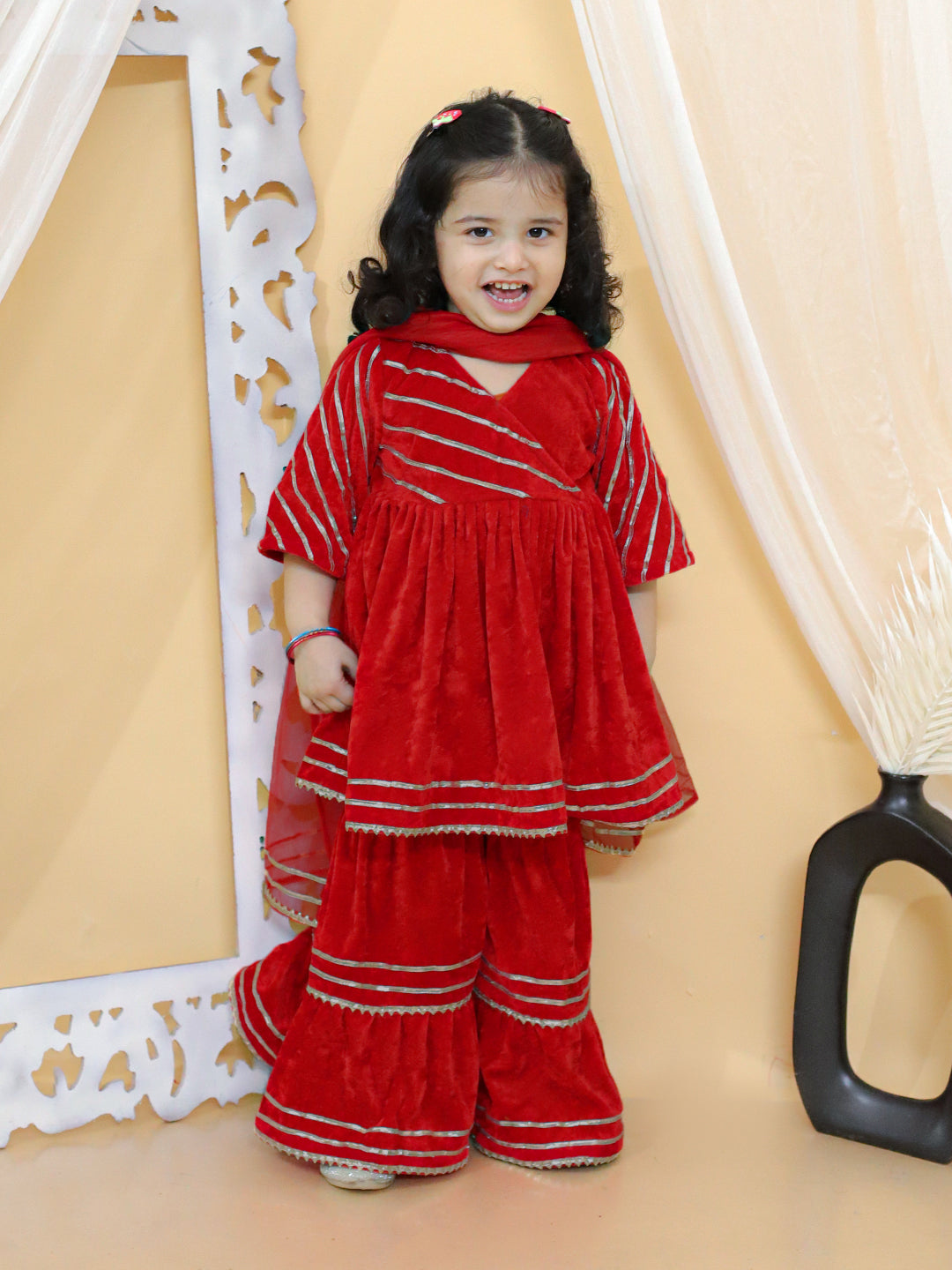 BownBee Velvet Patti Lace Work Anarkali Kurta with Sharara and Dupatta Set- Red