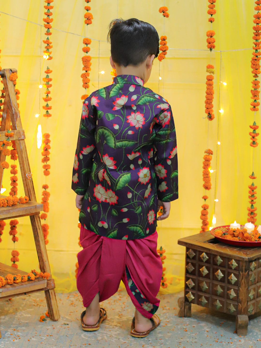 BownBee Printed Full Sleeve Sherwani with Cotton Dhoti for Boys- Purple