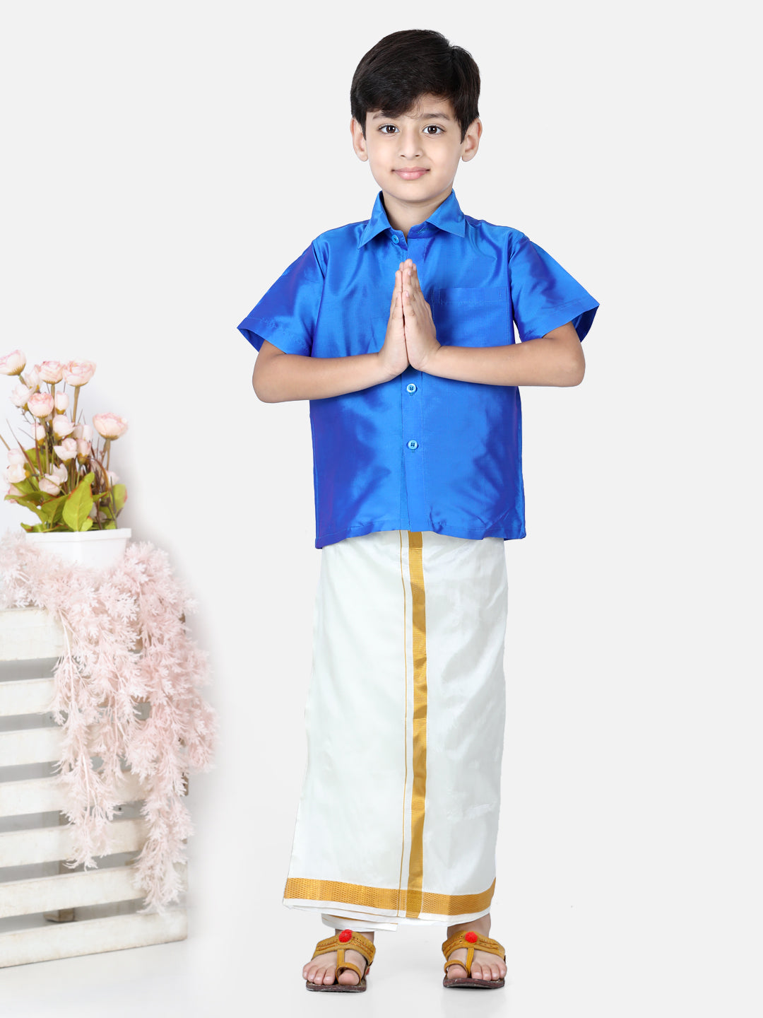 BownBee Half Sleeves Solid Shirt With Mundu Dhoti - Blue