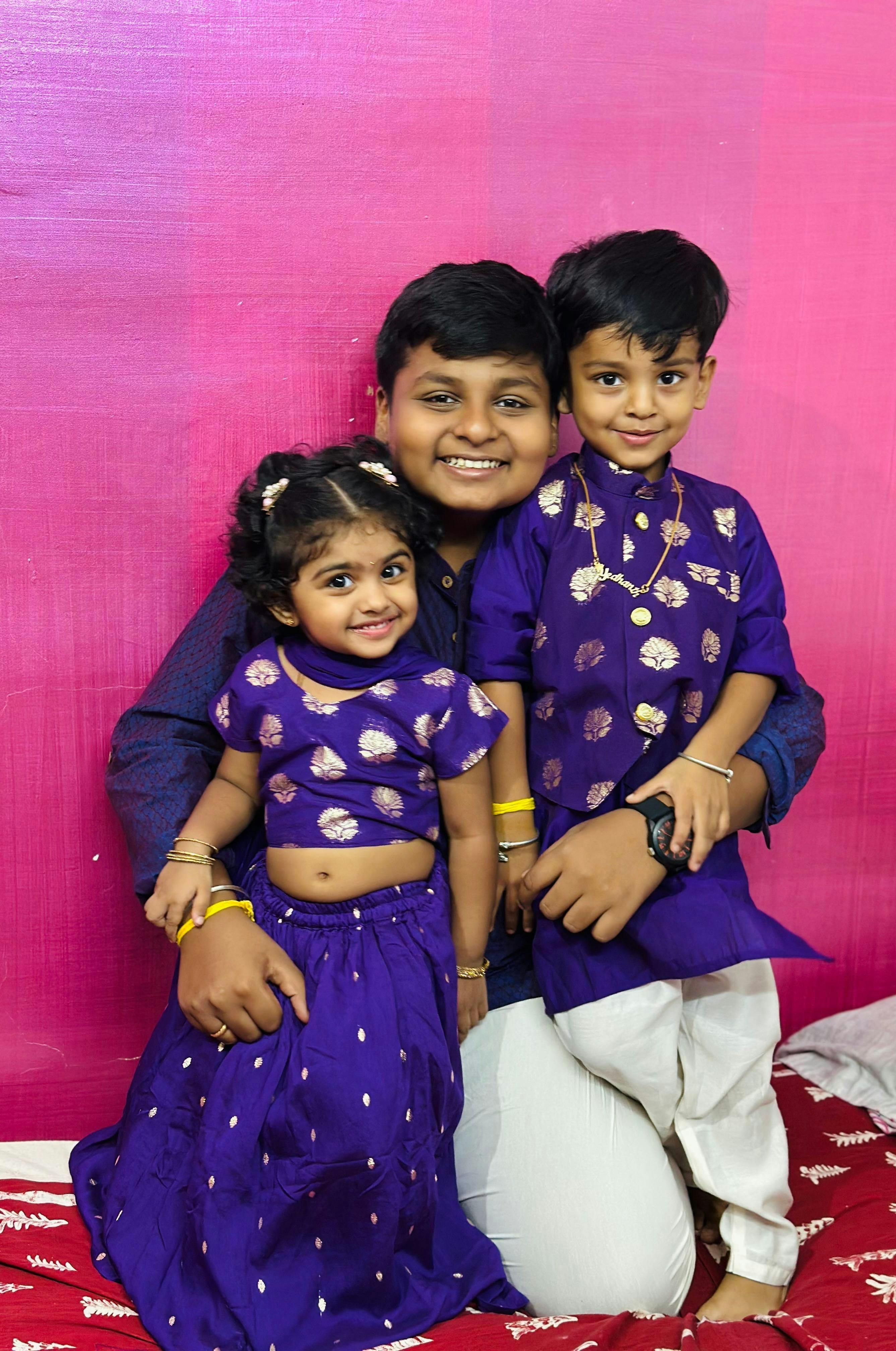 Indulge your little ones in luxury with the BownBee Chanderi Jacqurd Attached Jacket Kurta Pajama for Boys and Lehenga Choli Dupatta Set for Girls. Made with exquisite craftsmanship and intricate jacquard details, this elegant purple set will make your child stand out at any occasion.