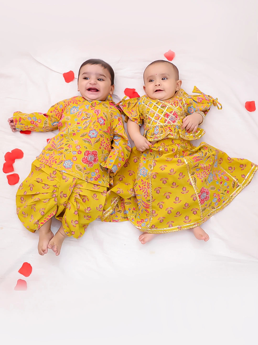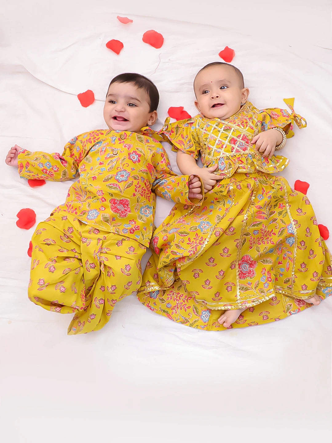 BownBee Festive Lehenga Choli & Dhoti Kurta Sibling Set For Infants - Yellow