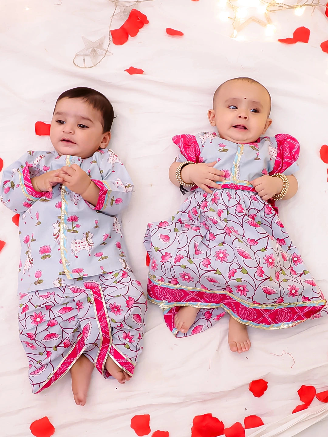 Dress your little ones in adorable ethnic style with the BownBee Festive Lehenga Choli & Dhoti Kurta Sibling Set for Infants – Sky Blue. Designed specially for babies and toddlers, this charming sibling collection features a beautifully crafted lehenga choli for girls and a matching dhoti kurta for boys, making it perfect for Rakhi celebrations, weddings, naming ceremonies, and all major festivals like Diwali, Janmashtami, Eid, and Navratri. Made from soft, breathable fabric with festive detailing, this traditional outfit for infants ensures maximum comfort and cuteness. Whether you’re shopping for a memorable Rakhi gift, baby festive clothing, or a coordinated Indian dress for kids, this set is a perfect choice for family photos, functions, or gifting. Available in multiple infant sizes, this toddler ethnic set adds grace, tradition, and joy to your baby’s special moments.