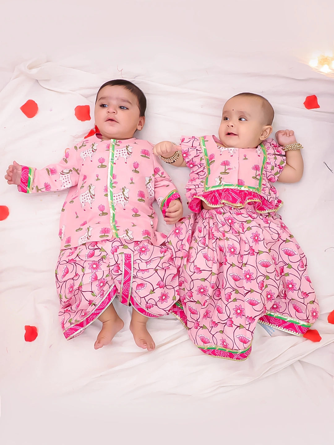 BownBee Festive Lehenga Choli & Dhoti Kurta Sibling Set for Infants | Traditional Rakhi & Wedding Wear – BownBee Festive Lehenga Choli & Dhoti Kurta Sibling Set For Infants - Pink (Pre-Order)