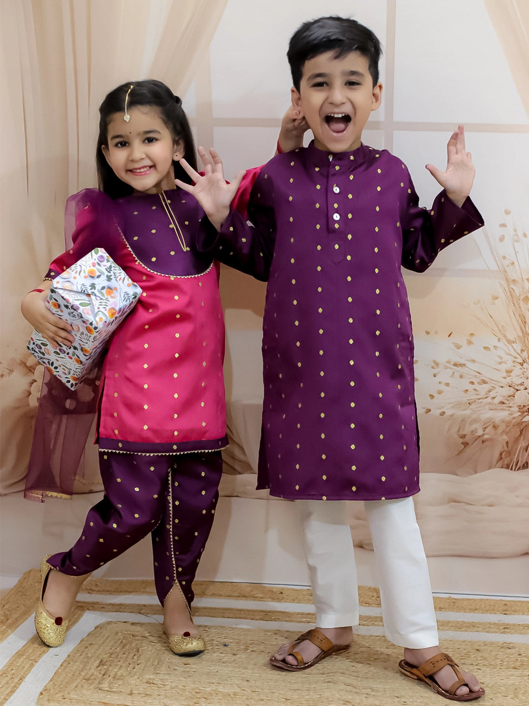 Indulge in luxury with our BownBee Malang zari kurta Pyjama & Dhunki Zari Kurta With Tulip Salwaar With Net Dupatta Sibling Set. This exclusive set pairs the intricate design of zari with the elegance of tulip salwaar and net dupatta. Perfect for siblings looking to make a statement in purple.