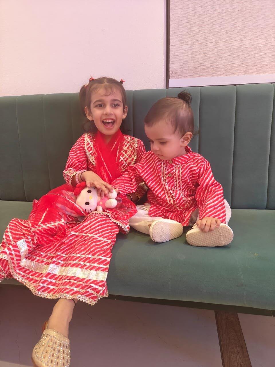 Elevate sibling style with the BownBee Pure Cotton Lurex Sharara Set paired with the Kurta Pajama Sibling Set in vibrant red. Crafted from breathable pure cotton, this ensemble combines traditional charm with subtle lurex accents for a refined shimmer. Perfect for festive occasions, it offers comfort and elegance, ensuring your little ones look coordinated and graceful.