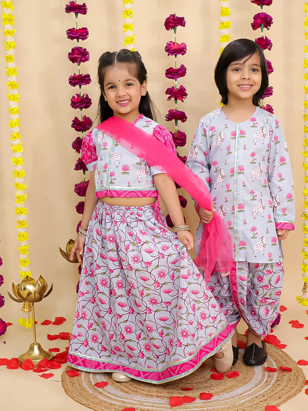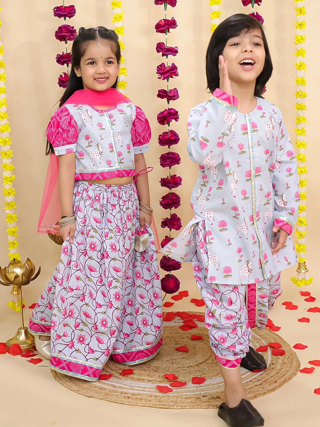 BownBee Pure Cotton Pichwai Printed Lehenga Choli & Dhoti Kurta Sibling Set - Sky Blue