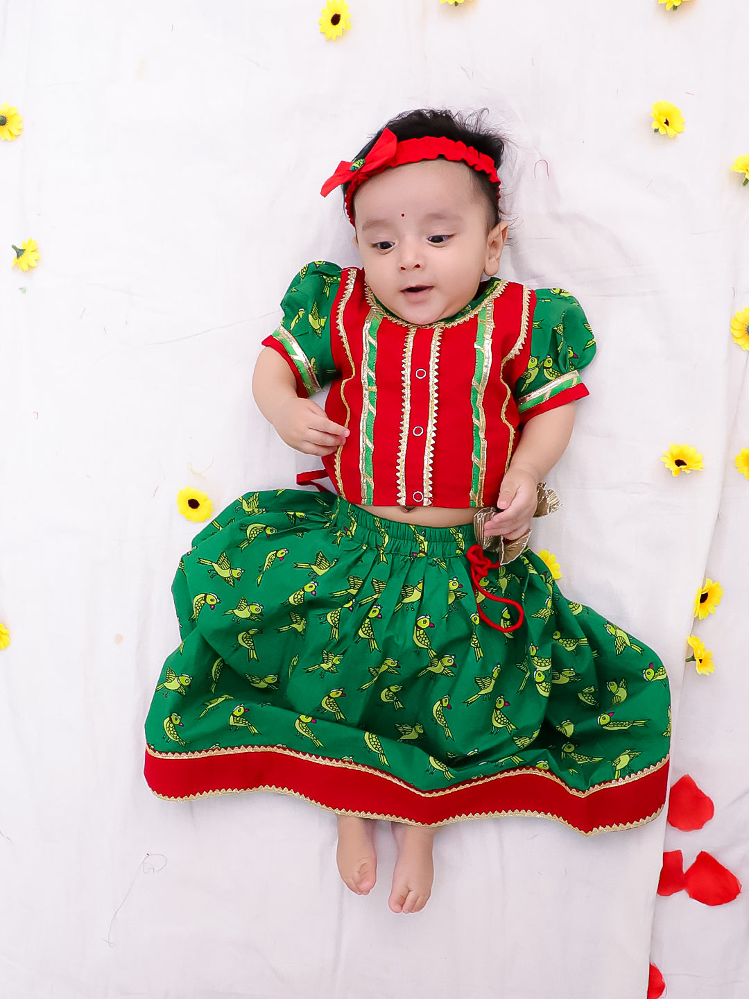 BownBee Pure Cotton Printed Lehenga Choli & Kurta Dhoti Sibling Set For Infants - Red