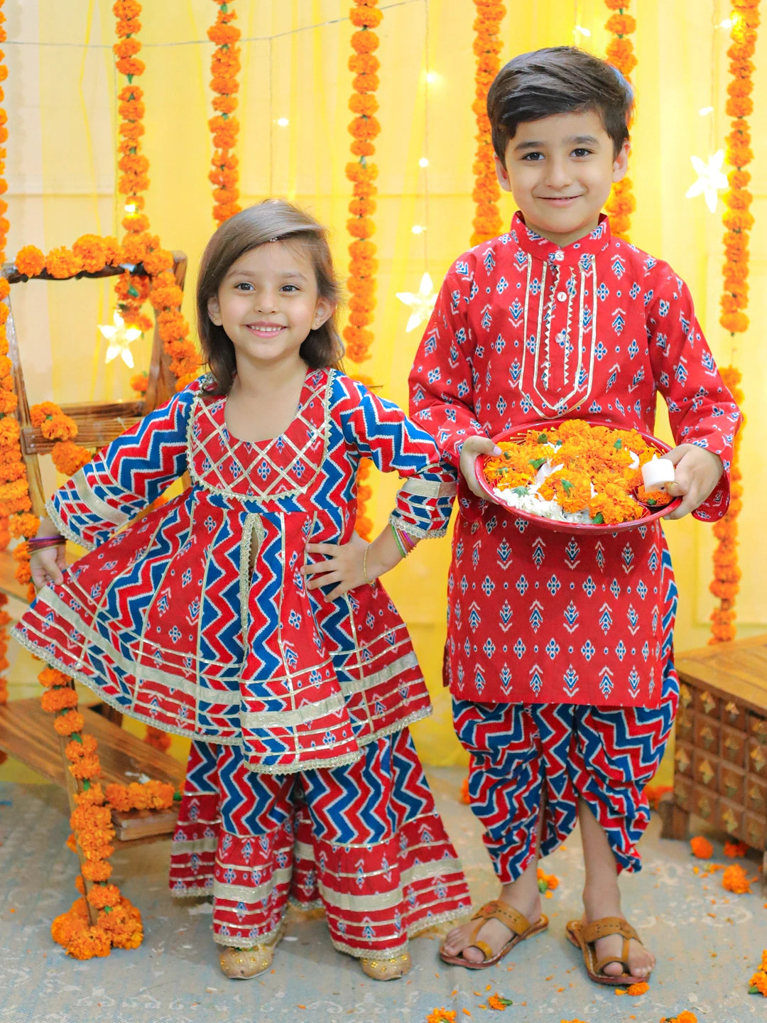BownBee Sibling Ethnic Festive Wear Pure Cotton Printed  with Gotta patti Kurta Sharara and Kurta Dhoti- Red