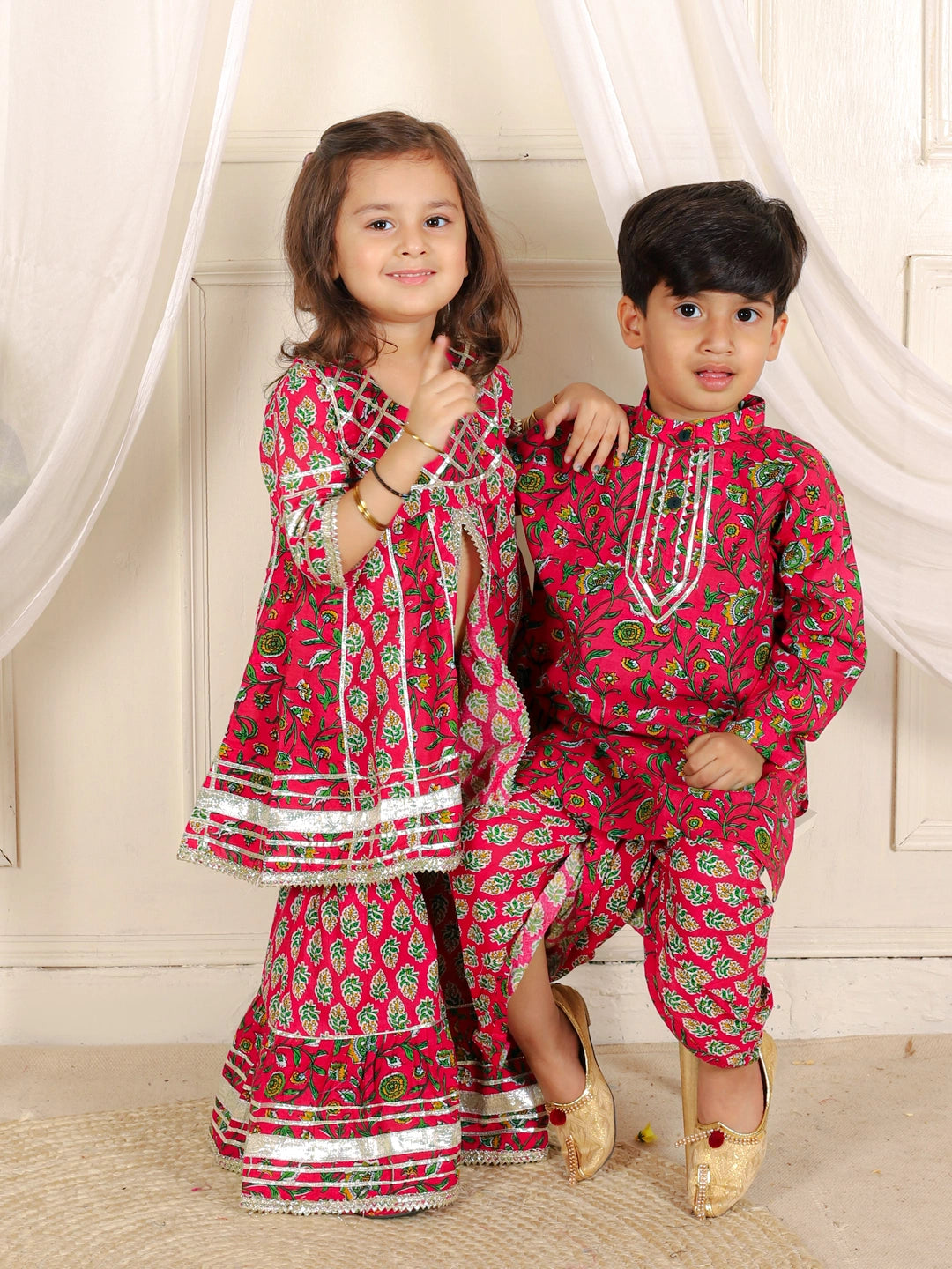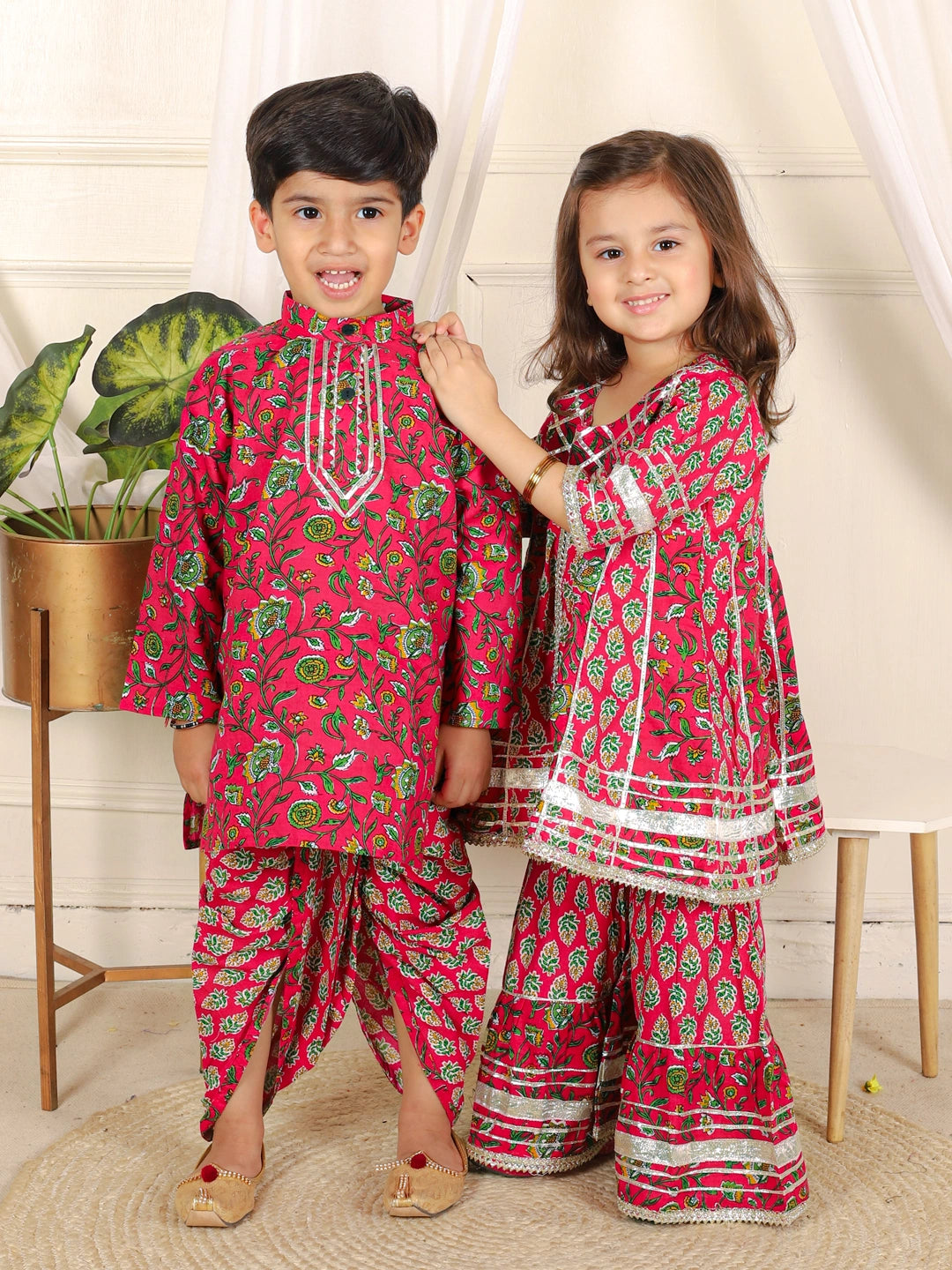 BownBee Sibling Pure Cotton Printed Kurta Sharara and Dhoti Kurta Set- Pink