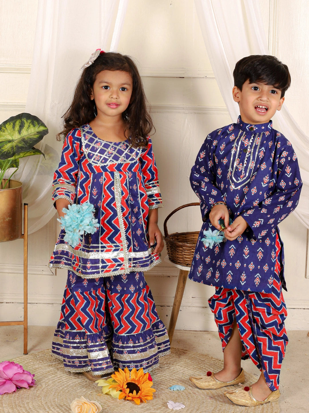 This BownBee Sibling Pure Cotton Printed Kurta Sharara and Dhoti kurta set is ideal for festive occasions. Cut from high-grade pure cotton fabric, it ensures breathability and durability. Featuring a unique print, this set offers a stylish look and is sure to make a bold and beautiful statement.