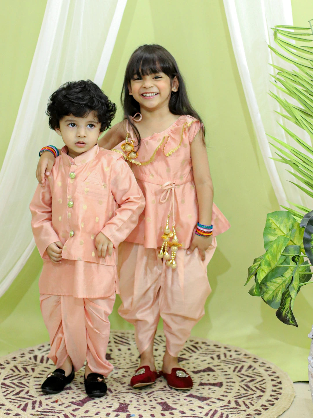 BownBee Sibling Set Chanderi Jacket with Chanderi Dhoti Kurta for Boys- Peach with Chanderi Silk One Shoulder Peplum with Dhoti- Peach