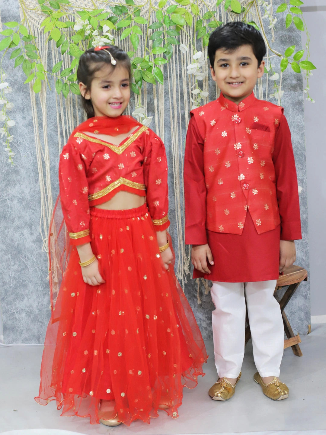 BownBee Sibling Set Jacquard Jacket with Full Sleeve Cotton Kurta Pajama for Boys- Red with Pure Chanderi 3/4th Sleeve Top with Lehenga & Dupatta- Red