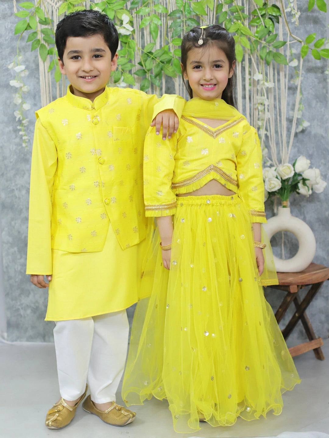 BownBee Sibling Set Jacquard Jacket with Full Sleeve Cotton Kurta Pajama for Boys- Yellow with Pure Chanderi 3/4th Sleeve Top with Lehenga & Dupatta- Yellow