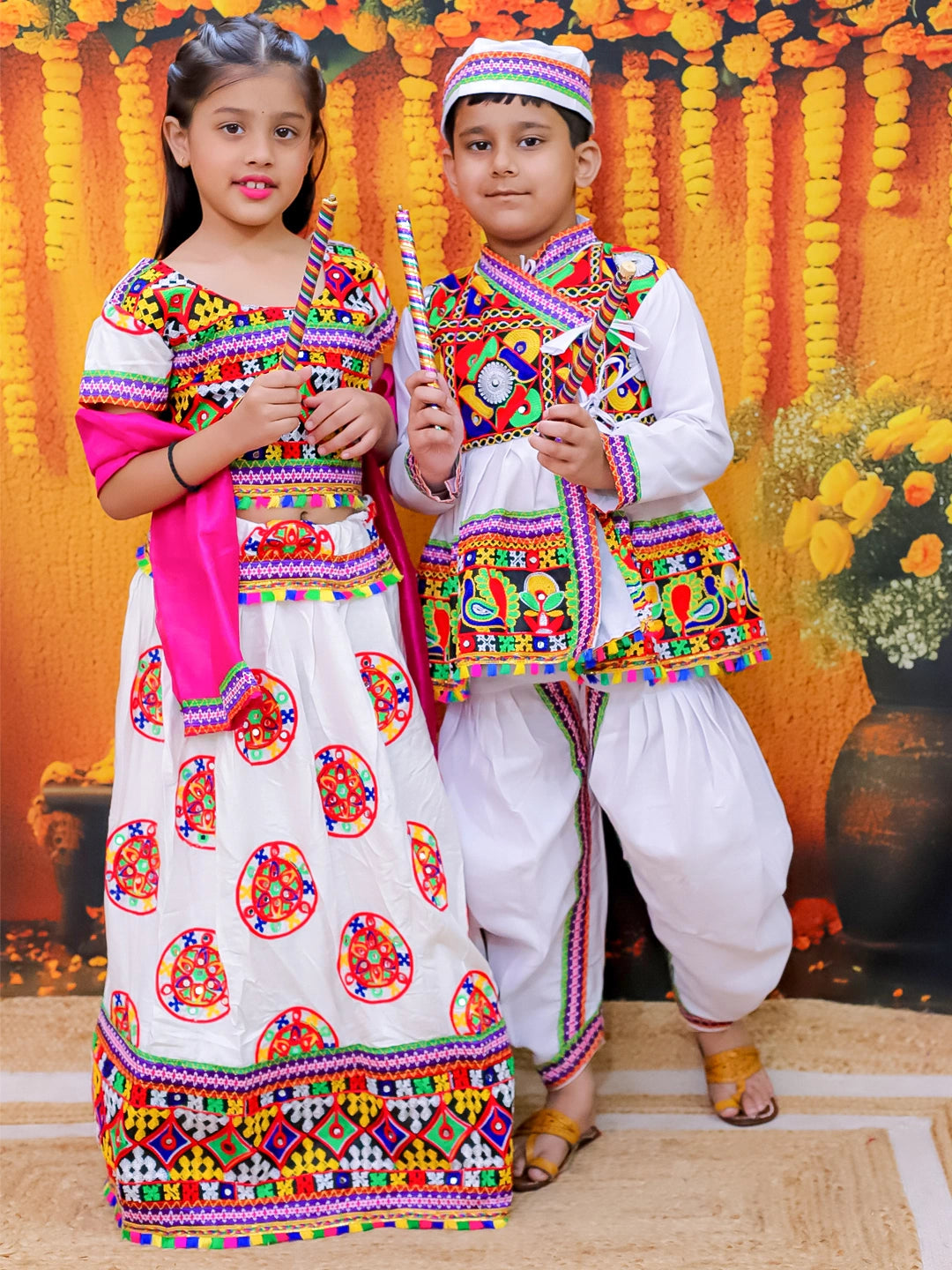 Embroidered Kedia Dhoti Cap Set for Boys with Embroidered Lehenga Half Sleeve Choli Dupatta Set for Girls- White