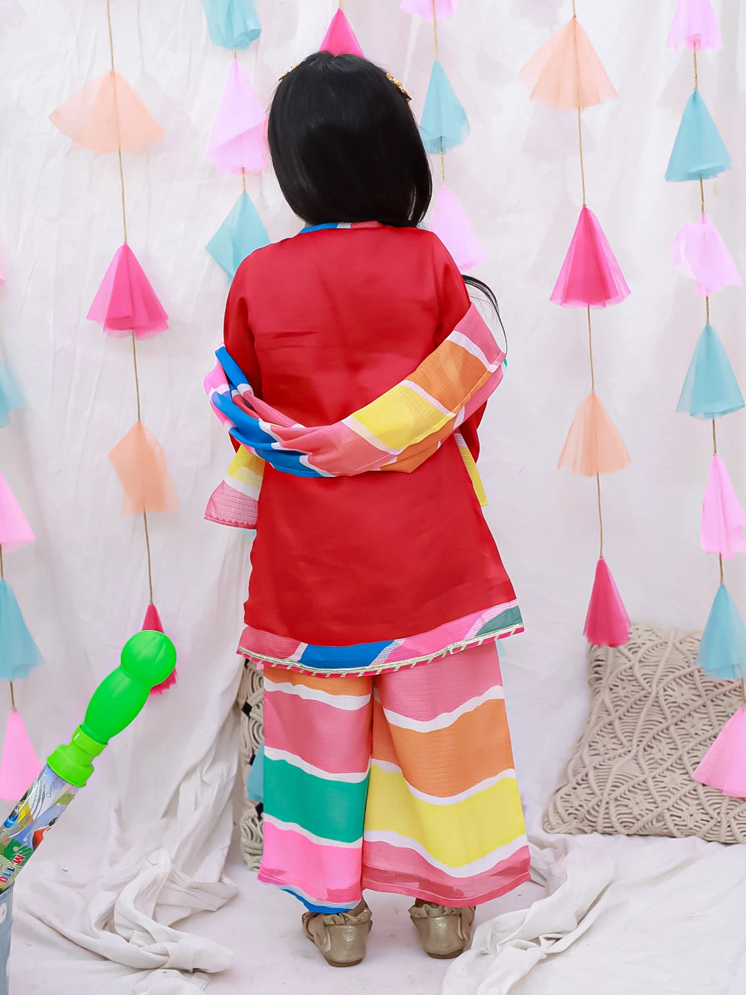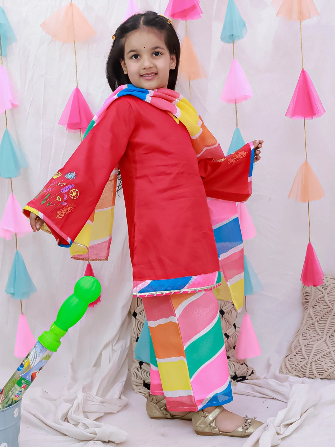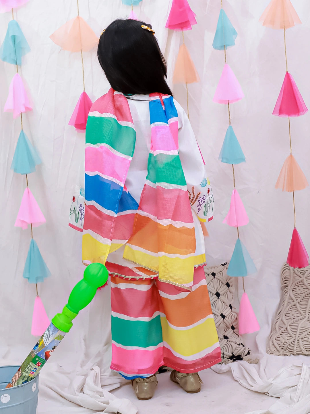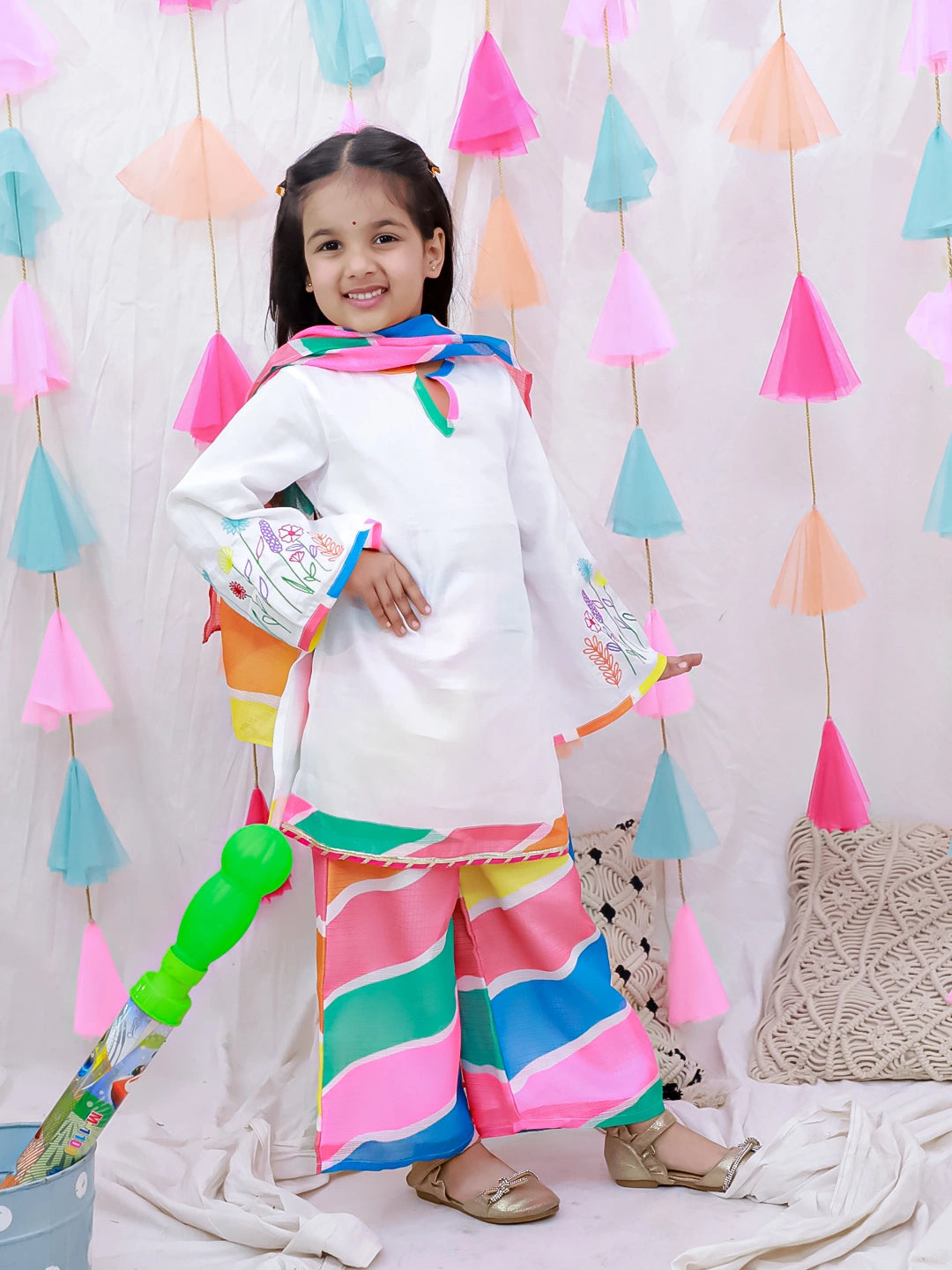 Introduce your daughter to timeless elegance with this exquisite embroidered suit set. Crafted with meticulous attention to detail, the white ensemble features delicate quarter-sleeve design paired with traditional dupatta draping. The intricate embroidery work adds a touch of sophistication, making it perfect for festivals, celebrations, and special occasions. Comfortable yet refined, this three-piece set combines classic Indian aesthetics with contemporary styling, ensuring your child looks graceful and poised at every event.