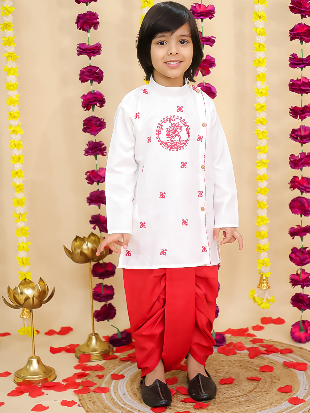 This elegant white kurta dhoti set in Bengali style offers a refined traditional look for boys. Featuring delicate embroidery, this kurta with dhoti for boys blends cultural heritage with comfortable tailoring, making it ideal for festive occasions and celebrations. Crafted from breathable fabric to ensure ease of movement, this cotton kurta dhoti for boys balances classic style with modern wearability.